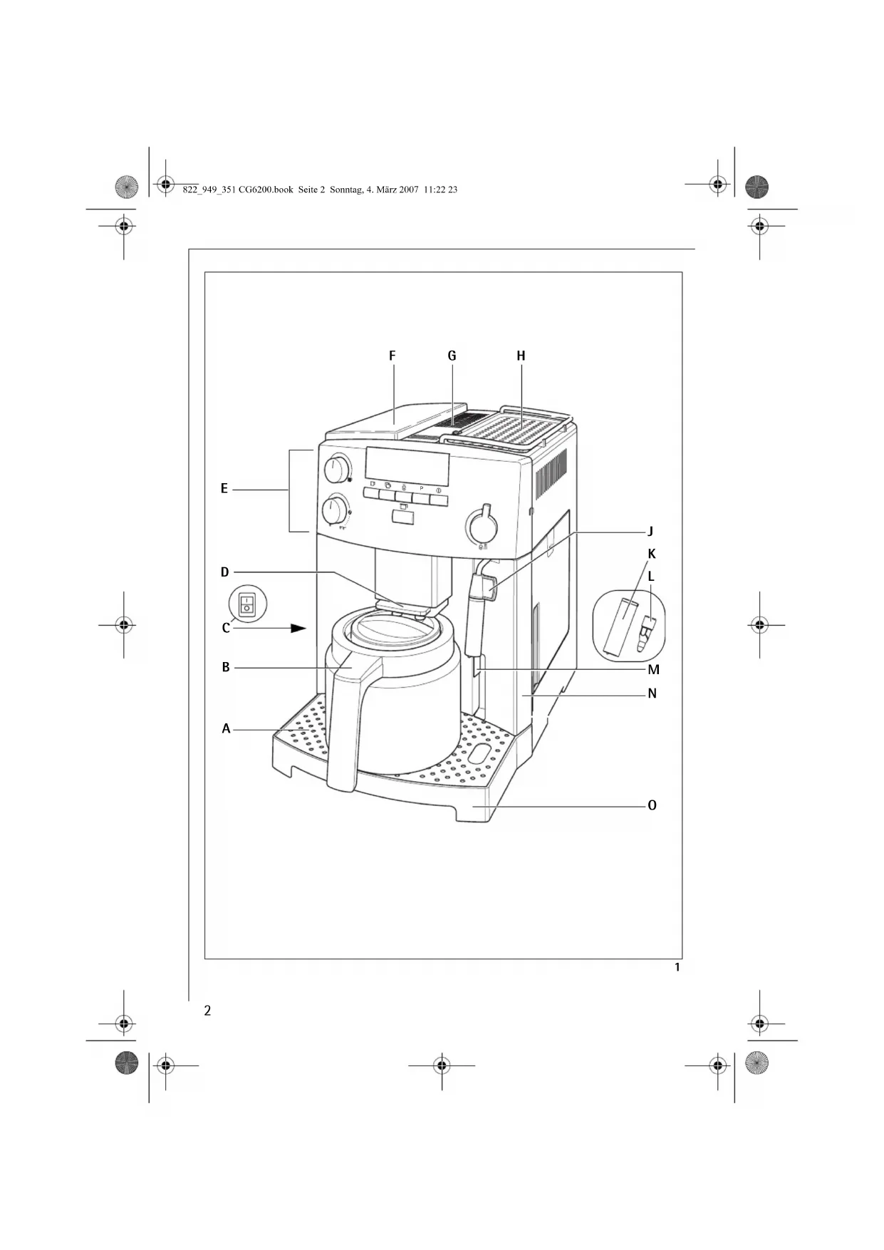 A Tropfgitter B Warmhaltekanne C Hauptschalter (Geräterückseite) D Höhenverstellbarer Kaffeeauslauf E Bedienfeld (siehe Bild 3) F Deckel für Kaffeebohnenbehälter G Deckel für Kaffeepulverschacht H Beheizte Tassenablage J Schwenkrohr für Dampf und Heiß- wasser K Dampfdüse (abnehmbar) L Dampfdüsen-Innenteil (abnehmbar) M Öffnungsknopf für Servicetür N Wassertank mit Max-Marke (entnehmbar) O Abtropfschale mit Schwimmer (entnehmbar)