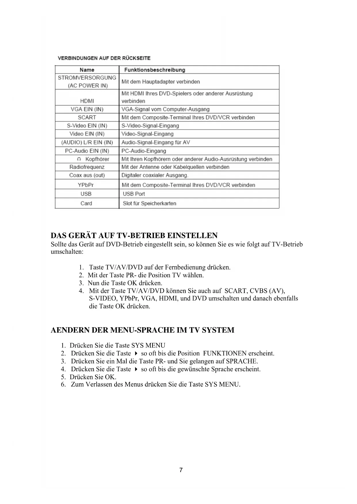 YPbPr, VGA, HDMI umschalten. Achtung: In der TV-Stellung funktioniert der Einzug oder Auswurf der DVD nicht, das Gerät muss mit der Taste TV/AV/DVD auf Position „DVD“ umgestellt werden!