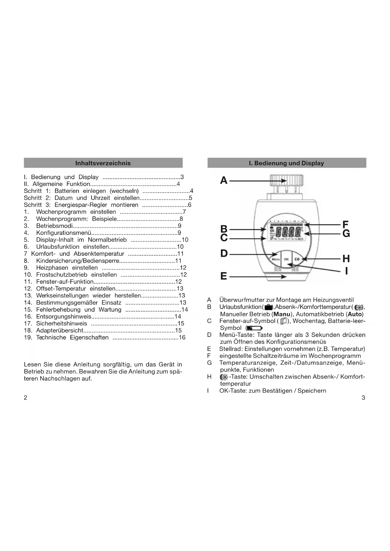 -Taste: Umschalten zwischen Absenk-/ Komfort- temperatur I OK-Taste: zum Bestätigen / Speichern Inhaltsverzeichnis