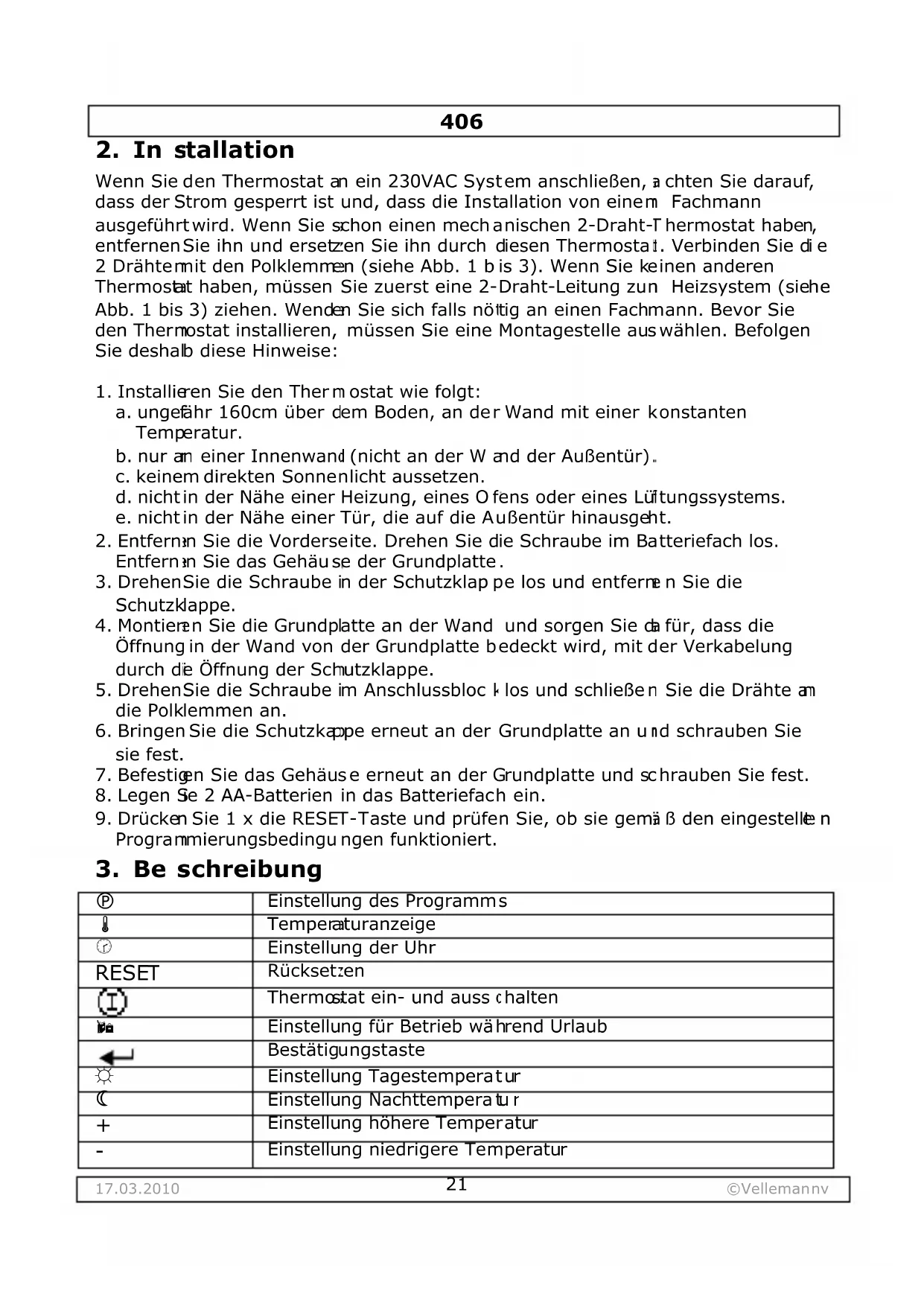 Wenn Sie den Thermostat an ein 230VAC System anschließen, achtEN Sie daraufuf, dass der Strom gespeRt ist und, dass die Installation von einem Fachmann ausgefuhrt wird. Wenn Sie schon einen mechanischen 2-Draht-Thermostat haben, entfernEN Sieihn und ersetzen Sieihn durch diesen Thermostat. VerbindEN Sie di e 2 Drahtemit den Polklemmen (siehe Abb. 1 bis 3). Wenn Sie keinen anderen Thermostat haben, mussEN Sie zuerst eine 2-Draht-Leitung zun Heizsystem (siehe Abb. 1 bis 3)ziehen. Wenden Sie sich falls nottig an einen Fachmann. Bevor Sie den Thermostat installmenten, mussEN Sie eine Montagestelle auswahlen. Befolgen Sie deshalb these Hinweise:
