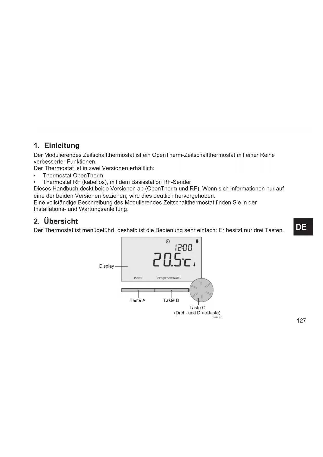 Der Thermostat ist menügeführt, deshalb ist die Bedienung sehr einfach: Er besitzt nur drei Tasten. Menü Programmwahl Taste A T000059-06-A Display Taste B Taste C (Dreh- und Drucktaste)128