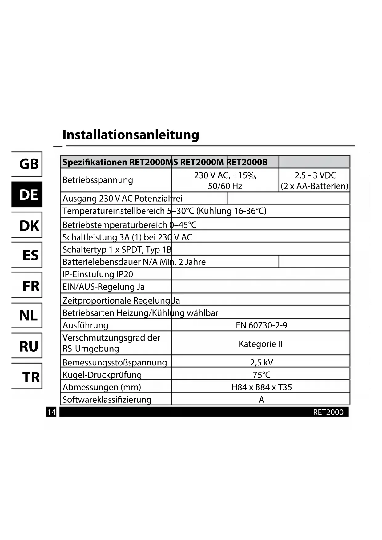 Spezikationen RET2000MS RET2000M RET2000B Betriebsspannung 230 V AC, ±15%, 50/60 Hz 2,5 - 3 VDC (2 x AA-Batterien) Ausgang 230 V AC Potenzialfrei Temperatureinstellbereich 5–30°C (Kühlung 16-36°C) Betriebstemperaturbereich 0–45°C Schaltleistung 3A (1) bei 230 V AC Schaltertyp 1 x SPDT, Typ 1B Batterielebensdauer N/A Min. 2 Jahre IP-Einstufung IP20 EIN/AUS-Regelung Ja Zeitproportionale Regelung Ja Betriebsarten Heizung/Kühlung wählbar Ausführung EN 60730-2-9 Verschmutzungsgrad der RS-Umgebung Kategorie II Bemessungsstoßspannung 2,5 kV Kugel-Druckprüfung 75°C Abmessungen (mm) H84 x B84 x T35 Softwareklassizierung A InstallationsanleitungDanfoss Heating