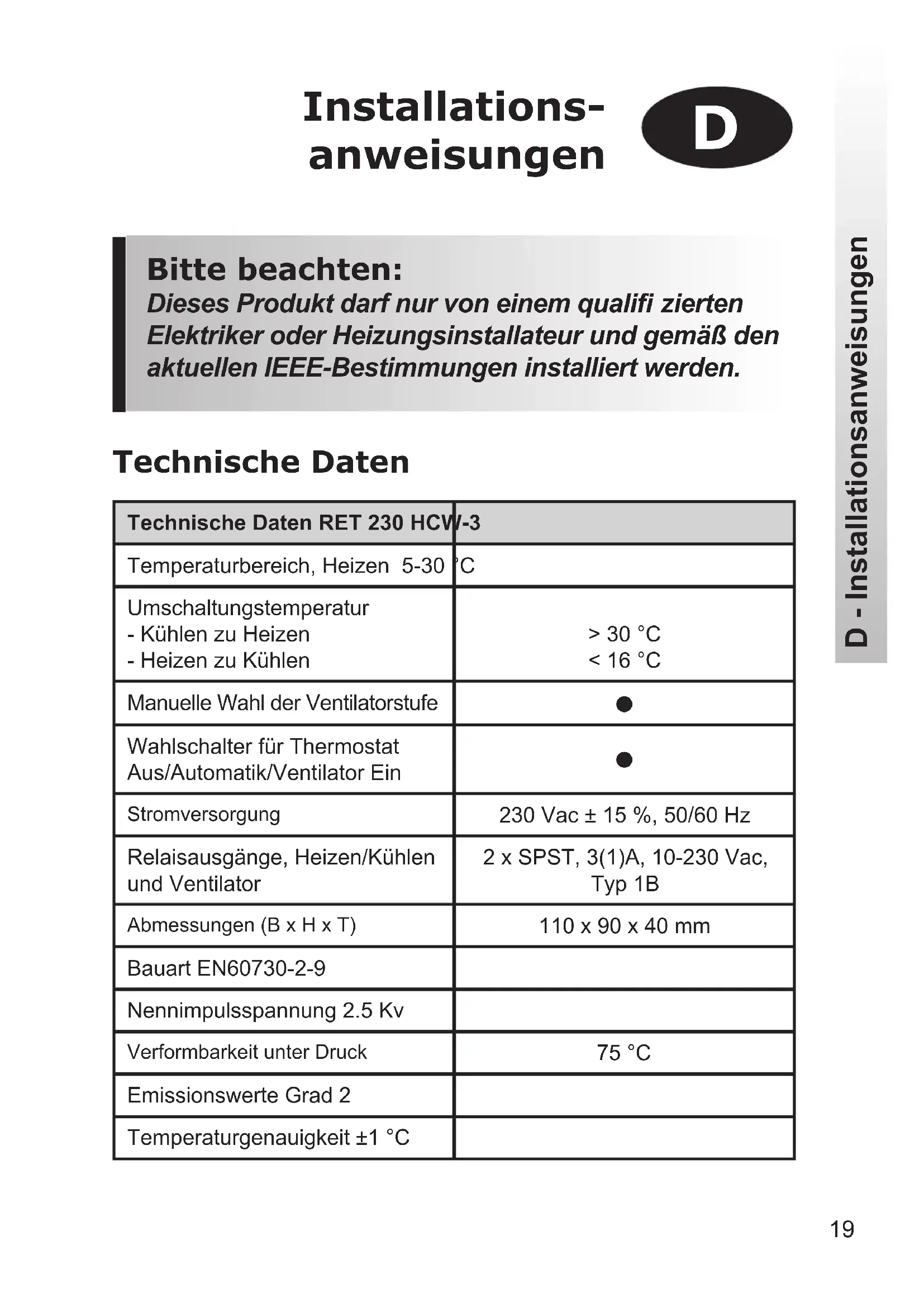 D - Installationsanweisungen Technische Daten RET 230 HCW-3Temperaturbereich, Heizen 5-30 °CUmschaltungstemperatur - Kühlen zu Heizen- Heizen zu Kühlen> 30 °C< 16 °CManuelle Wahl der Ventilatorstufe Wahlschalter für Thermostat Aus/Automatik/Ventilator Ein Stromversorgung230 Vac ± 15 %, 50/60 HzRelaisausgänge, Heizen/Kühlen und Ventilator2 x SPST, 3(1)A, 10-230 Vac, Typ 1BAbmessungen (B x H x T)110 x 90 x 40 mmBauart EN60730-2-9Nennimpulsspannung 2.5 KvVerformbarkeit unter Druck75 °CEmissionswerte Grad 2Temperaturgenauigkeit ±1 °C Technische Daten20 D - Installationsanweisungen Produktübersicht Der Thermostat ist für den Einsatz in Heiz-und Kühlsystemen im 2-Rohr-System mit Ventilator-Luftkühlern gedacht, wobei die Umschaltung von Heizen auf Kühlen über ein zentrales Umschaltsystem erfolgt. Der Thermostat regelt den Betrieb eines elektrischen Ventils, das während der Heizperiode den Wärmebedarf und während der Kühlperiode den Kühlbedarf regelt. Der Übergang von Heizen auf Kühlen erfolgt automatisch durch Temperaturmessung am Vorlaufrohr. Übersteigt die Temperatur 30 °C, arbeitet der Thermostat als Heizthermostat, bei Temperaturen unter 16°C als Kühlthermostat. Wichtiger Hinweis: Der Kreislauf, in dem sich der Anlegefühler befi ndet, darf nicht gesperrt sein und Wasser muss jederzeit am Fühler vorbeifl ießen. Hierzu kann u. U. der Einbau eines Bypass-Ventils zwischen Systemfl uss und Rücklauf am Ende jedes Heiz-/ Kühlkreises erforderlich sein. Installation Entfernen Sie zuerst die Wandplatte auf der Geräterückseite Um das Einsteckmodul zu befestigen, sind 30 mm nach oben und 100 mm nach unten freizuhalten. !21 Befestigen Sie den Thermostaten in einer Höhe von 1,5 m über dem Boden, frei von Luftzug oder Wärmequellen, wie z. B. Heizkörpern, offenen Feuerstellen oder direktem Sonnenlicht. Positionierung des Anlegefühlers Bringen Sie den Anlegefühler mit Hilfe des mitgelieferten Spannbands am Vorlaufrohr an.Wichtiger Hinweis: Der Kreislauf, in dem sich der Anlegefühler befi ndet, darf nicht gesperrt sein und Wasser muss jederzeit am Fühler vorbeifl ießen. Hierzu kann u. U. der Einbau eines Bypass-Ventils zwischen Systemfl uss und Rücklauf am Ende jedes Heiz-/ Kühlkreises erforderlich sein.