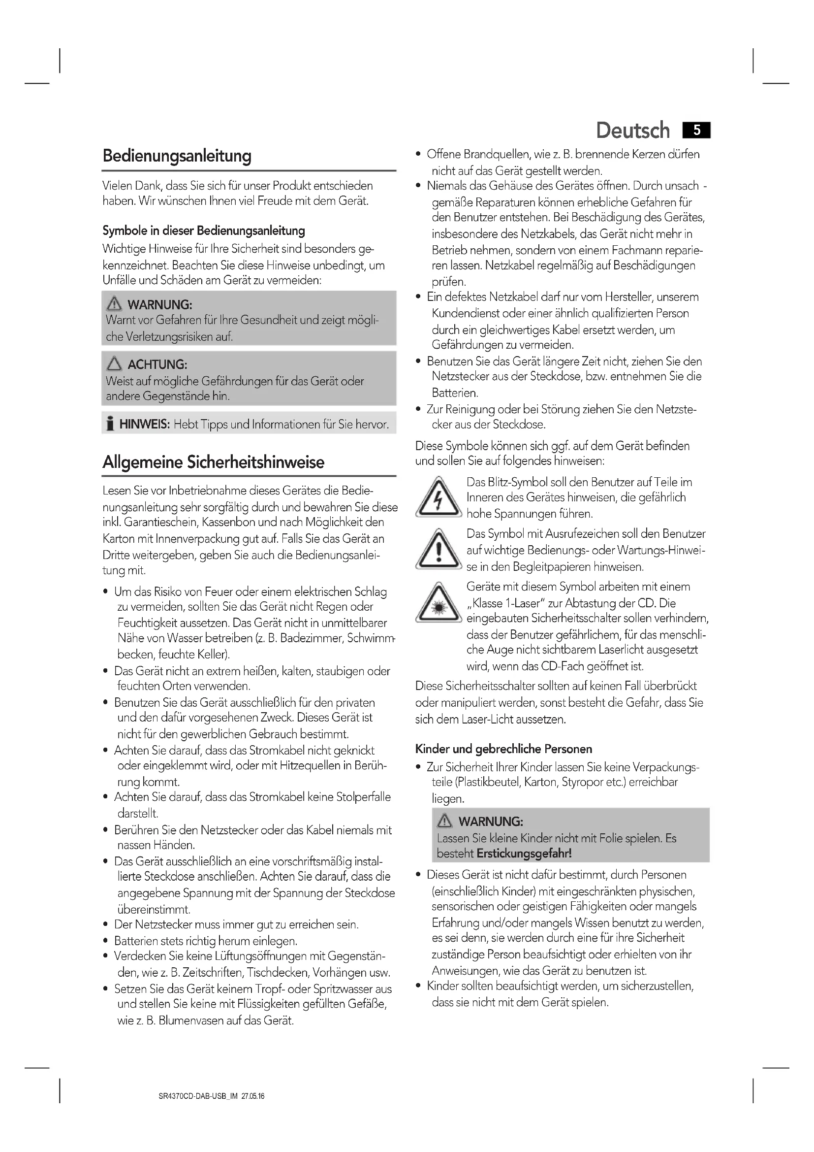 rien ein, oder betrei- ben Sie das Gerät mit dem Netzkabel. CD springt während der Wiedergabe. Kontrollieren Sie die Disc auf Fingerabdrücke, Schmutz oder Kratzer. Säubern Sie diese mit einem weichen Tuch von der Mitte heraus. Technische Daten Modell: ...................................................SR 4370 CD / DAB+ / USB Spannungsversorgung: .............................................230 V~, 50 Hz Batteriebetrieb: ......................................... 6 x 1,5 V, Typ UM 2 /R 14 Leistungsaufnahme: ................................................................. 15 W Schutzklasse: ...................................................................................Ⅱ Nettogewicht: .................................................................. ca. 1,57 kg Radioteil Frequenzbereiche: .................................. FM 87,5 ~ 108,0 MHz ........... DAB/DAB+ 174,92 ~ 239,20 MHz Technische und gestalterische Änderungen im Zuge stetiger Produktentwicklungen vorbehalten. Hinweis zur Richtlinienkonformität Hiermit erklärt der Hersteller, dass sich das Gerät SR4370CD / DAB+ / USB in Übereinstimmung mit den folgenden Anfor- derungen befindet: