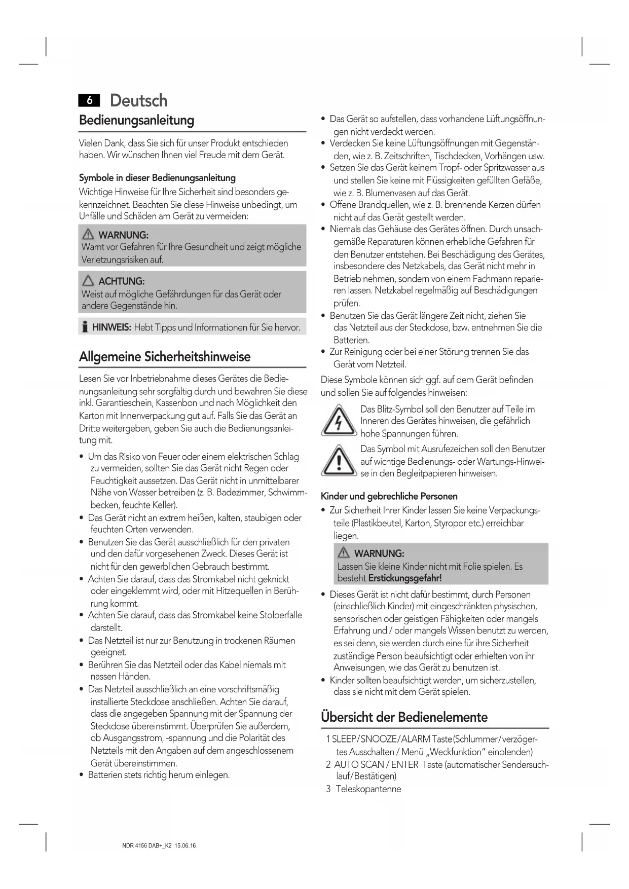 - Kinder sollten beaufsichtigt werden, um sicherzustellen, dass sie nicht mit dem Gerät spielen. Übersicht der Bedienelemente 1 SLEEP / SNOOZE / ALARM Taste (Schlummer / verzöger- tes Ausschalten / Menü „Weckfunktion“ einblenden) 2 AUTO SCAN / ENTER Taste (automatischer Sendersuch- lauf / Bestätigen) 3 TeleskopantenneDeutsch