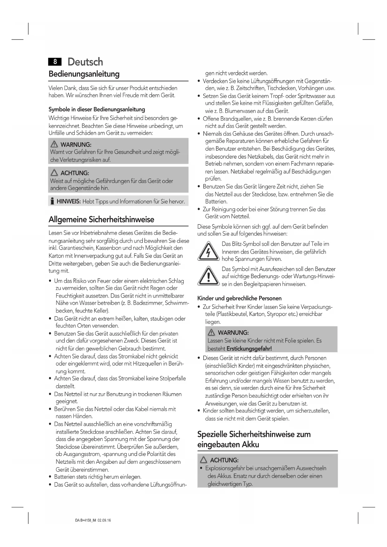 rogeräten vorgesehenen Sammelstellen und geben dort Ihre Elektrogeräte ab, die Sie nicht mehr benutzen werden. Sie helfen damit die potenziellen Auswirkungen, durch falsche Entsorgung, auf die Umwelt und die menschliche Gesundheit zu vermeiden. Sie leisten damit Ihren Beitrag zur Wiederverwertung, zum Recycling und zu anderen Formen der Verwertung von Elektro- und Elektronik-Altgeräten. Informationen, wo die Geräte zu entsorgen sind, erhalten Sie über Ihre Kommunen oder die Gemeindeverwaltungen. Batterieentsorgung Das Gerät enthält einen wiederaufladbaren Akku. Verbrauchte Akkumulatoren (Akkus) gehören nicht in den Hausmüll. Der Akku muss entnommen werden, bevor das Produkt in die Entsorgung geht. Wenden Sie sich hierfür an qualifiziertes Fachpersonal. Informationen, wo der Akku zu entsorgen ist, erhalten Sie über Ihre Kommunen oder die Gemeindeverwaltungen.18 Nederlands DA B+4158_IM 02.09.16 Gebruiksaanwijzing Dank u voor uw keuze van dit product. We hopen dat u er veel plezier van beleeft. Symbolen in deze gebruiksaanwijzing Belangrijke aanwijzingen voor uw veiligheid zijn speciaal gekenmerkt. Neem deze aanwijzingen strikt in acht om ongevallen en schade aan het apparaat te vermijden: WAARSCHUWING: Waarschuwt voor gevaren voor uw gezondheid en toont mogelijk letselrisico’s. LET OP: Wijst op mogelijke gevaren voor het apparaat of andere voorwerpen. OPMERKING: Kenmerkt tips en informatie voor u. Algemene veiligheidsinstructies Lees vóór de ingebruikname van dit apparaat de handleiding uiterst zorgvuldig door en bewaar deze goed, samen met het garantiebewijs, de kassabon en zo mogelijk de doos met de binnenverpakking. Geef ook de handleiding mee wanneer u de machine aan derden doorgeeft.