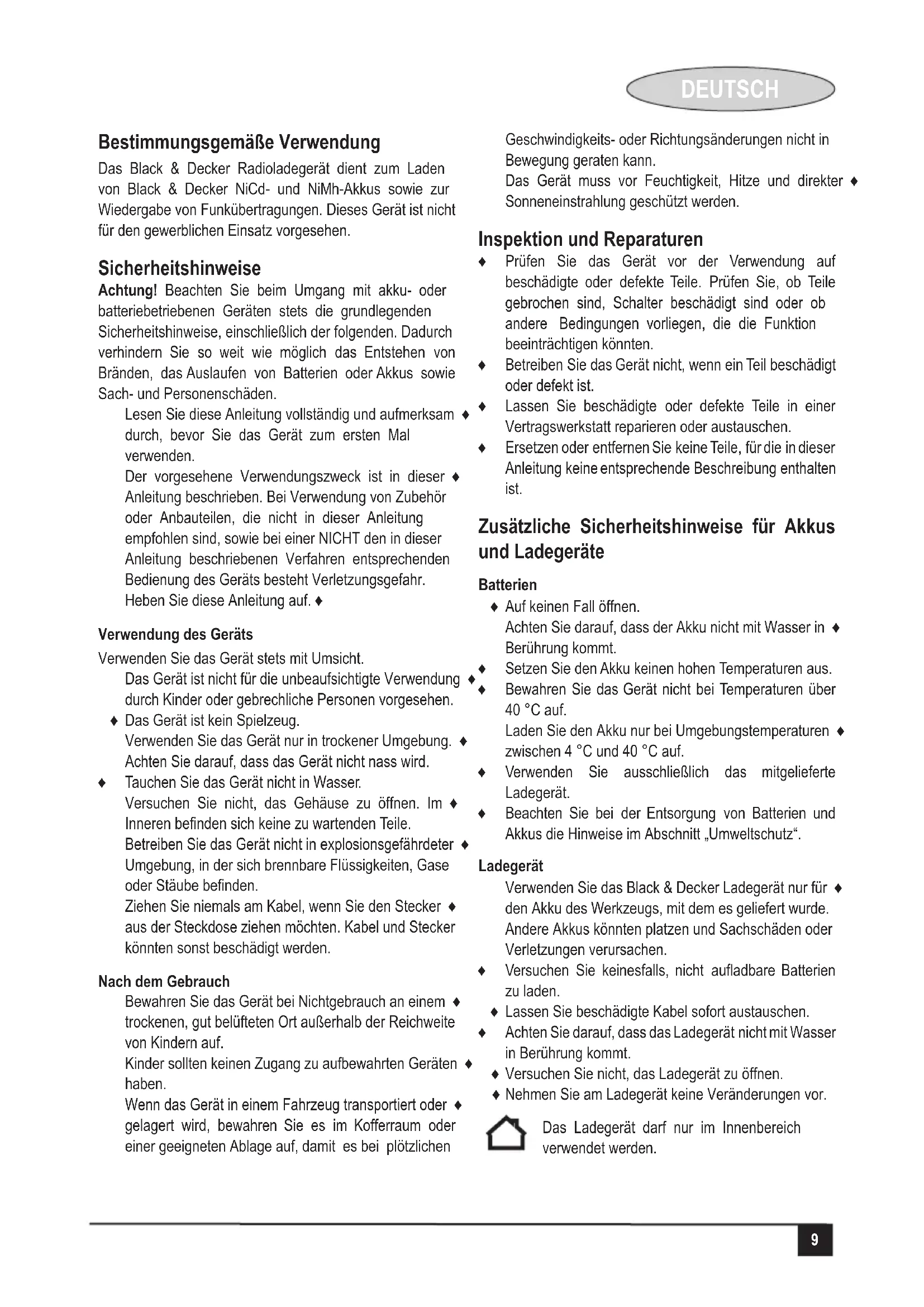 HEnglish Intended use Your Black & Decker radio charger has been designed for charging Black & Decker NiCd and NiMh batteries and for playing radio transmissions. This product is intended for consumer use only. Safety instructions Warning! When using battery-powered appliances, basic safety precautions, including the following, should always be followed to reduce the risk of re, leaking batteries, personal injury and material damage. Read all of this manual carefully before using the ♦ appliance. The intended use is described in this manual. The use ♦ of any accessory or attachment or the performance of any operation with this appliance other than those recommended in this instruction manual may present a risk of personal injury. Retain this manual for future reference. ♦ Using your appliance Always take care when using the appliance. This appliance is not intended for use by young or inrm ♦ persons without supervision. The appliance is not to be used as a toy. ♦ Use in a dry location only. Do not allow the unit to ♦ become wet. Do not immerse the appliance in water. ♦ Do not open body casing. There are no user-serviceable ♦ parts inside. Do not operate the appliance in explosive atmospheres, ♦ such as in the presence of ammable liquids, gases or dust. To reduce the risk of damage to plugs and cords never ♦ pull the cable to remove the plug from a socket outlet. After use When not in use, the appliance should be stored in a ♦ dry, well ventilated place out of the reach of children. Children should not have access to stored appliances. ♦ When the appliance is stored or transported in a vehicle ♦ it should be placed in the boot or restrained to prevent movement following sudden changes in speed or direction. The appliance should be protected from direct sunlight, ♦ heat and moisture. Inspection and repairs Before use, check the appliance for damaged or ♦ defective parts. Check for breakage of parts, damage to switches and any other conditions that may affect its operation. Do not use the appliance if any part is damaged or ♦ defective. Have any damaged or defective parts repaired or ♦ replaced by an authorised repair agent. Never attempt to remove or replace any parts other ♦ than those specied in this manual. Additional safety instructions – batteries and chargers Batteries Never attempt to open for any reason. ♦ Do not expose the battery to water. ♦ Do not expose the battery to heat. ♦ Do not store in locations where the temperature may ♦ exceed 40°C. Charge only at ambient temperatures between 4°C and ♦ 40°C. Charge only using the charger provided with the tool. ♦ When disposing of batteries, follow the instructions ♦ given in the section “Protecting the environment”. Chargers Use your Black & Decker charger only to charge the ♦ battery in the tool with which it was supplied. Other batteries could burst, causing personal injury and damage. Never attempt to charge non-rechargeable batteries. ♦ Have defective cords replaced immediately. ♦ Do not expose the charger to water. ♦ Do not open the charger. ♦ Do not probe the charger. ♦ The charger is intended for indoor use only. Electrical safety This charger is double insulated; therefore no earth wire is required. Always check that the power supply corresponds to the voltage on the rating plate. If the supply cord is damaged, it must be replaced by the manufacturer or an authorised Black & Decker Service Centre in order to avoid a hazard. ENGLISH 4Features This appliance includes some or all of the following features: ac Power adaptor receptacle (rear of unit)1. Charging port (rear of unit)2. Antenna3. Power on/off, volume control4. Bass selector5. Speaker6. Charging indicator7. AM/FM/AUX selector8. Station selector buttons9. MP3 player door10. Mode indicator11. Bass boost indicator12. Station frequency13. ac Power adaptor (not shown) Battery pack (not included) Use Battery cap information Battery storage and carrying caps are provided for use whenever the battery is out of the tool or charger. Remove cap before placing battery in charger or tool. Charging the Power Pack Warning! Battery shall not be exposed to excessive heat such as sunshine, re or the like. The radio charger should be used in a well ventilated area only. The radio charger is designed to use standard household 230 Vac. Insert the plug of the power adaptor into the radio ♦ charger as shown in Figure B. Insure that the charger plug is correctly aligned with the radio socket before pushing to full depth. Plug the power adaptor into any standard 230 Vac ♦ electrical outlet. NOTE: Do not charge by means of an engine generator or DC power source. Use only 230 Vac. Slide the power pack into the back of the unit as shown ♦ in Figure C. Make sure the power pack is fully seated in the port and let the pack charge initially for 9 hours. After the initial charge, under normal usage, your power pack should be fully charged in 3 to 6 hours. The amber charger light on the radio face (g. D) will ♦ light indicating that the charging process has started. Important charging notes After normal usage, your power pack should be ♦ fully charged in 3 to 6 hours. If the pack is run-down completely, it may take up to 9 hours to become fully charged. Your power pack was sent from the factory in an uncharged condition. Before attempting to use it, you must charge for at least 9 hours. DO NOT charge the power pack in an air temperature ♦ below 4°C or above 40°C. This is important and will prevent serious damage to the power pack. Longest life and best performance can be obtained if power packs are charged when air temperature is about 25°C. While charging, the charger may hum and become ♦ warm to touch. This is a normal condition and does not indicate a problem. If the power pack does not charge properly: ♦ Check current at receptacle by plugging in a lamp or - other appliance. Check to see if receptacle is connec