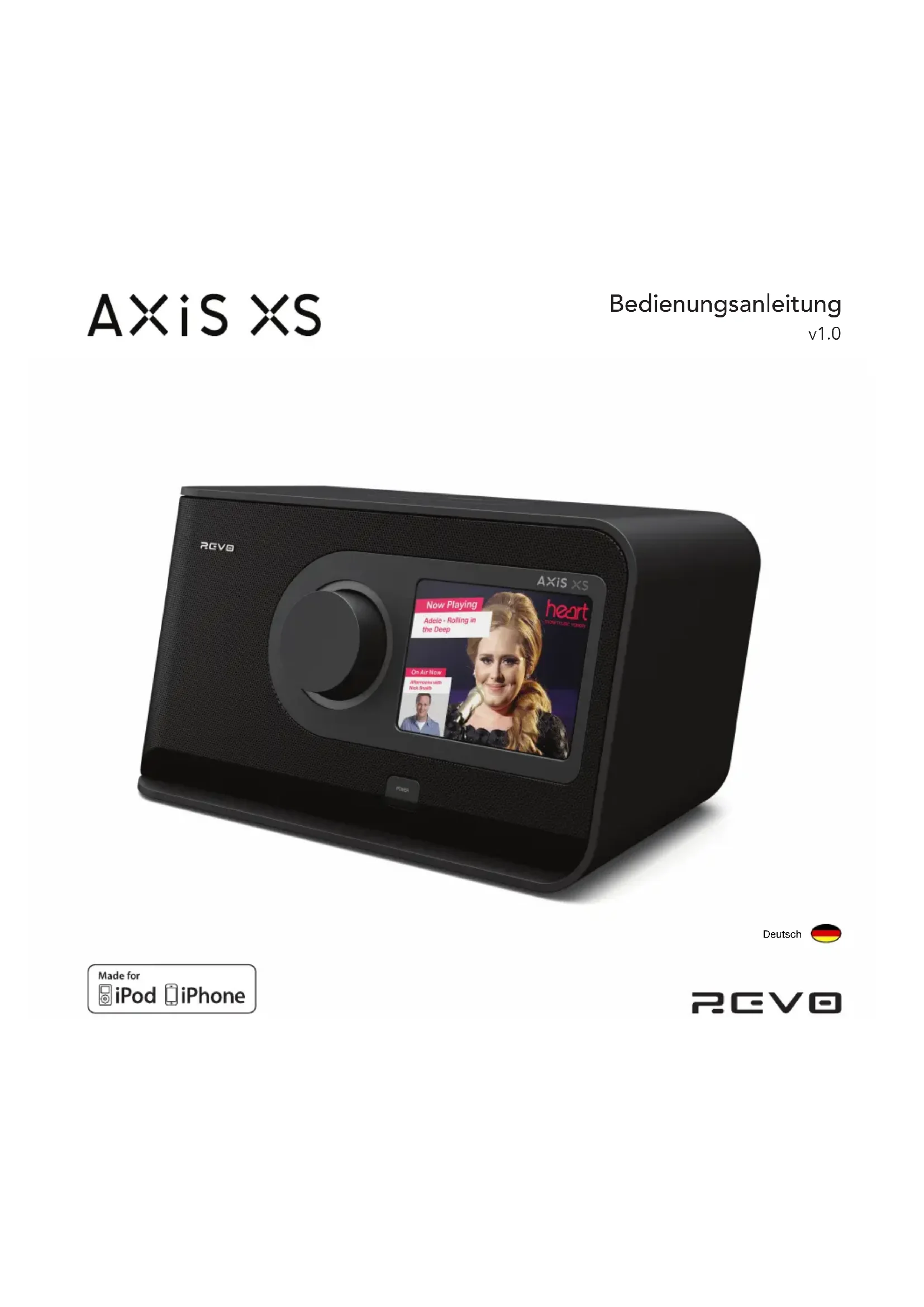 - Vermeiden Sie kleine Gegenstände und Flüssigkeiten die in das Produkt gelangen koennten Garantie Revo Technologies Ltd garantiert dem Endkunden, dass dieses Produkt bei normalem Gebrauch frei von Material-und Verarbeitungsfehlern für einen Zeitraum von einem Jahr ab dem Kaufdatum sein wird. Diese Garantie umfasst Ausfälle aufgrund von Fabrikationsfehlern und gilt nicht in Fällen wie Unfallschäden, allgemeine Abnutzung, Nachlässigkeit vom Benutzer, Änderungen oder Reparaturen die nicht von Revo Technologies Ltd zugelassen wurden. Zur Anmeldung Ihres Kaufes besuchen Sie bitte www.revo.co.uk Urheberrecht und Danksagung Copyright 2012 Revo technologies Ltd. All rights reserved. Kein Teil dieser Veröffentlichung darf in irgendeiner Form oder Weise kopiert, verbreitet, übertragen oder umgeschrieben werden weder elektronisch, mechanisch, magnetisch, manuell oder anderweitig, ohne die Erlaubnis der Revo Technologies Limited REVO and AXiS XS sind Warenzeichen oder eingetragene Marken von Revo Technologies Ltd iPod, iPhone und iPad sind eingetragene Marken von Apple Inc., registriert in den USA und anderen Ländern. Revo Technologies Ltd The Inox Building, Caldwellside, Lanark, Scotland, United Kingdom, ML11 7SR Tel: 01555 66 61 61 Int. Tel: +44 1555 66 61 61 Fax: 01555 66 33 44 Int. Fax: +44 1555 66 33 44 Email: enquiries@revo.co.uk Website: www.revo.co.uk Haftungsausschluss Revo Technologies Limited macht keine Zusicherungen oder Garantien in Bezug auf den Inhalt dieser Veröffentlichung und lehnt insbesondere jede stillschweigende Gewährleistung der Marktgängigkeit oder Eignung für einen bestimmten Zweck ab.23 Deutsch Inhalt Willkommen Vielen Dank dass Sie sich zum Kauf dieses AXiS XS Radios entschieden haben. Wir sind sicher, dass es Ihnen viele Jahre lang verlässlich Freude bereiten wird. Diese Bedienungsanleitung wurde entwickelt, um Ihnen eine schnelle Inbetriebnahme Ihres Radios zu ermöglichen und sie mit den Eigenschaften dieses Produktes vertraut zu machen. Weiterhin bietet sie Ihnen Information zur Bedienung des Gerätes, Sicherheitsaspe- kten, Garantiedetails und Problemlösungen. Das Auspacken Ihres AXiS XS Radios Entnehmen Sie Ihr AXiS XS Radio und die weiteren mitgelieferten Artikel vorsichtig aus der Verpackung. Die Verpackung sollte folgendes enthalten: