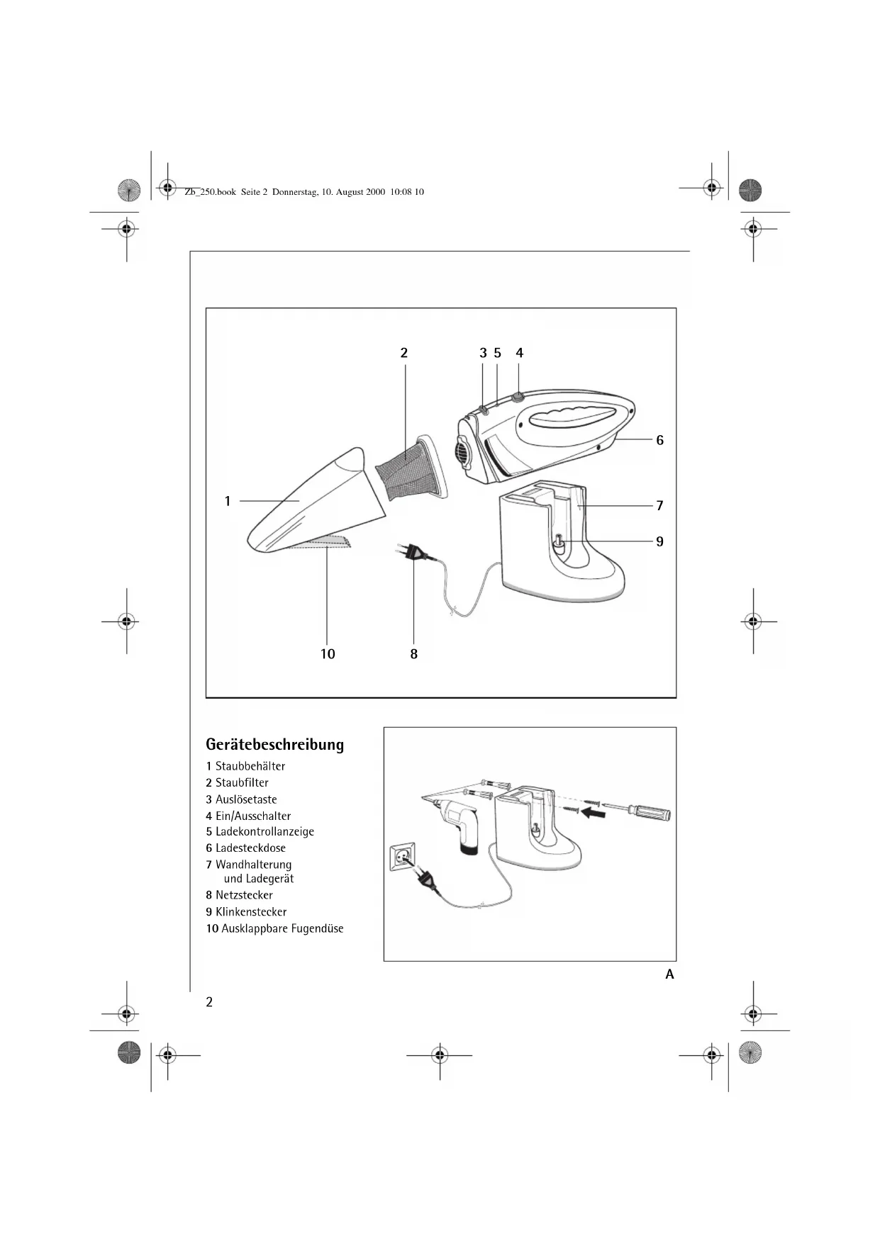 Gerätebeschreibung 1 Staubbehälter 2 Staubfilter 3 Auslösetaste 4 Ein/Ausschalter 5 Ladekontrollanzeige 6 Ladesteckdose 7 Wandhalterung und Ladegerät 8 Netzstecker 9 Klinkenstecker 10 Ausklappbare Fugendüse