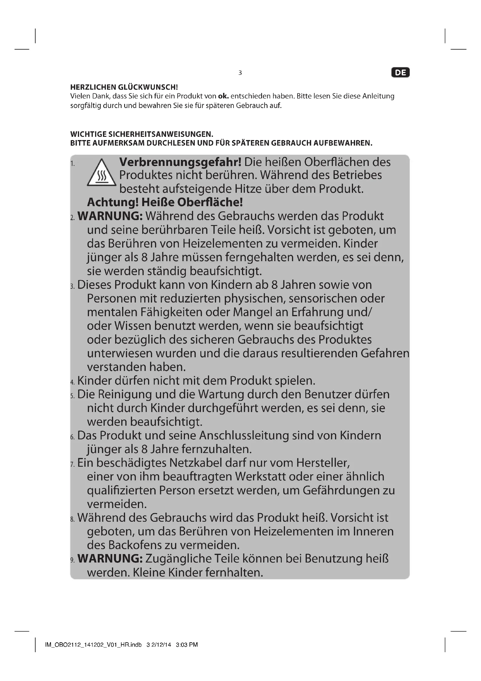 HERZLICHEN GLÜCKWUNSCH! Vielen Dank, dass Sie sich für ein Produkt von ok. entschieden haben. Bitte lesen Sie diese Anleitung sorgfältig durch und bewahren Sie sie für späteren Gebrauch auf. WICHTIGE SICHERHEITSANWEISUNGEN. BITTE AUFMERKSAM DURCHLESEN UND FÜR SPÄTEREN GEBRAUCH AUFBEWAHREN.