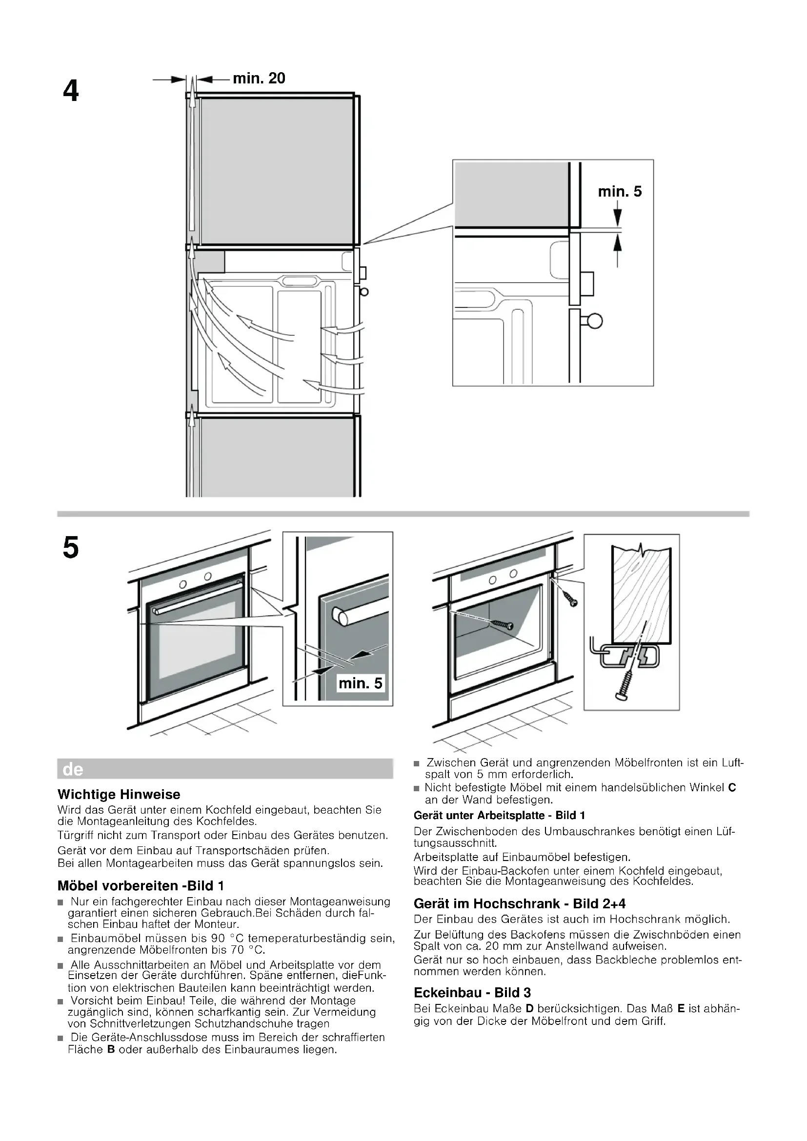 MontageanleitungWichtige HinweiseWird das Gerät unter einem Kochfeld eingebaut, beachten Sie die Montageanleitung des Kochfeldes.Türgriff nicht zum Transport oder Einbau des Gerätes benutzen.Gerät vor dem Einbau auf Transportschäden prüfen.Bei allen Montagearbeiten muss das Gerät spannungslos sein.Möbel vorbereiten -Bild 1■ Nur ein fachgerechter Einbau nach dieser Montageanweisung garantiert einen sicheren Gebrauch.Bei Schäden durch fal-schen Einbau haftet der Monteur.■ Einbaumöbel müssen bis 90 °C temeperaturbeständig sein, angrenzende Möbelfronten bis 70 °C.■ Alle Ausschnittarbeiten an Möbel und Arbeitsplatte vor dem Einsetzen der Geräte durchführen. Späne entfernen, dieFunk-tion von elektrischen Bauteilen kann beeinträchtigt werden.■ Vorsicht beim Einbau! Teile, die während der Montage zugänglich sind, können scharfkantig sein. Zur Vermeidung von Schnittverletzungen Schutzhandschuhe tragen■ Die Geräte-Anschlussdose muss im Bereich der schraffierten Fläche B oder außerhalb des Einbauraumes liegen.■ Zwischen Gerät und angrenzenden Möbelfronten ist ein Luft-spalt von 5 mm erforderlich. ■ Nicht befestigte Möbel mit einem handelsüblichen Winkel C an der Wand befestigen.Gerät unter Arbeitsplatte - Bild 1Der Zwischenboden des Umbauschrankes benötigt einen Lüf-tungsausschnitt.Arbeitsplatte auf Einbaumöbel befestigen.Wird der Einbau-Backofen unter einem Kochfeld eingebaut, beachten Sie die Montageanweisung des Kochfeldes.Gerät im Hochschrank - Bild 2+4Der Einbau des Gerätes ist auch im Hochschrank möglich.Zur Belüftung des Backofens müssen die Zwischnböden einen Spalt von ca. 20 mm zur Anstellwand aufweisen.Gerät nur so hoch einbauen, dass Backbleche problemlos ent-nommen werden können.Eckeinbau - Bild 3 Bei Eckeinbau Maße D berücksichtigen. Das Maß E ist abhän- gig von der Dicke der Möbelfront und dem Griff. PLQ PLQ