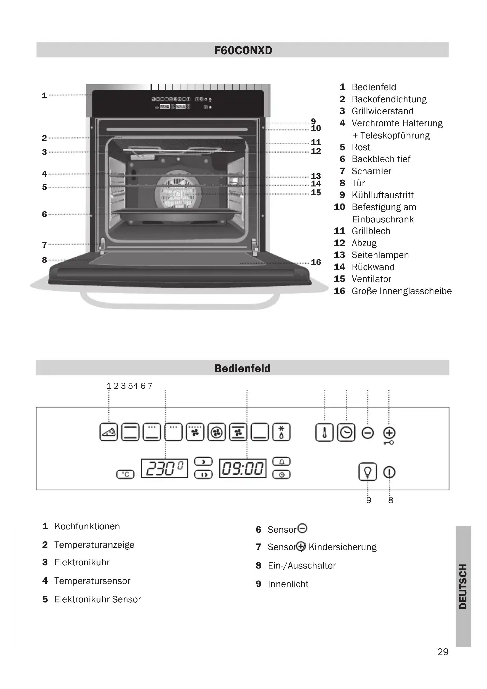 16 Sensor 17 Sensor / Kindersicherung 18 Ein-/Ausschalter 19 Innenlicht 11 Bedienfeld 12 Backofendichtung 13 Grillwiderstand 14 Verchromte Halterung + Teleskopführung 15 Rost 16 Backblech tief 17 Scharnier 18 Tür 19 Kühlluftaustritt 10 Befestigung am Einbauschrank 11 Grillblech 12 Abzug 13 Seitenlampen 14 Rückwand 15 Ventilator 16 Große Innenglasscheibe