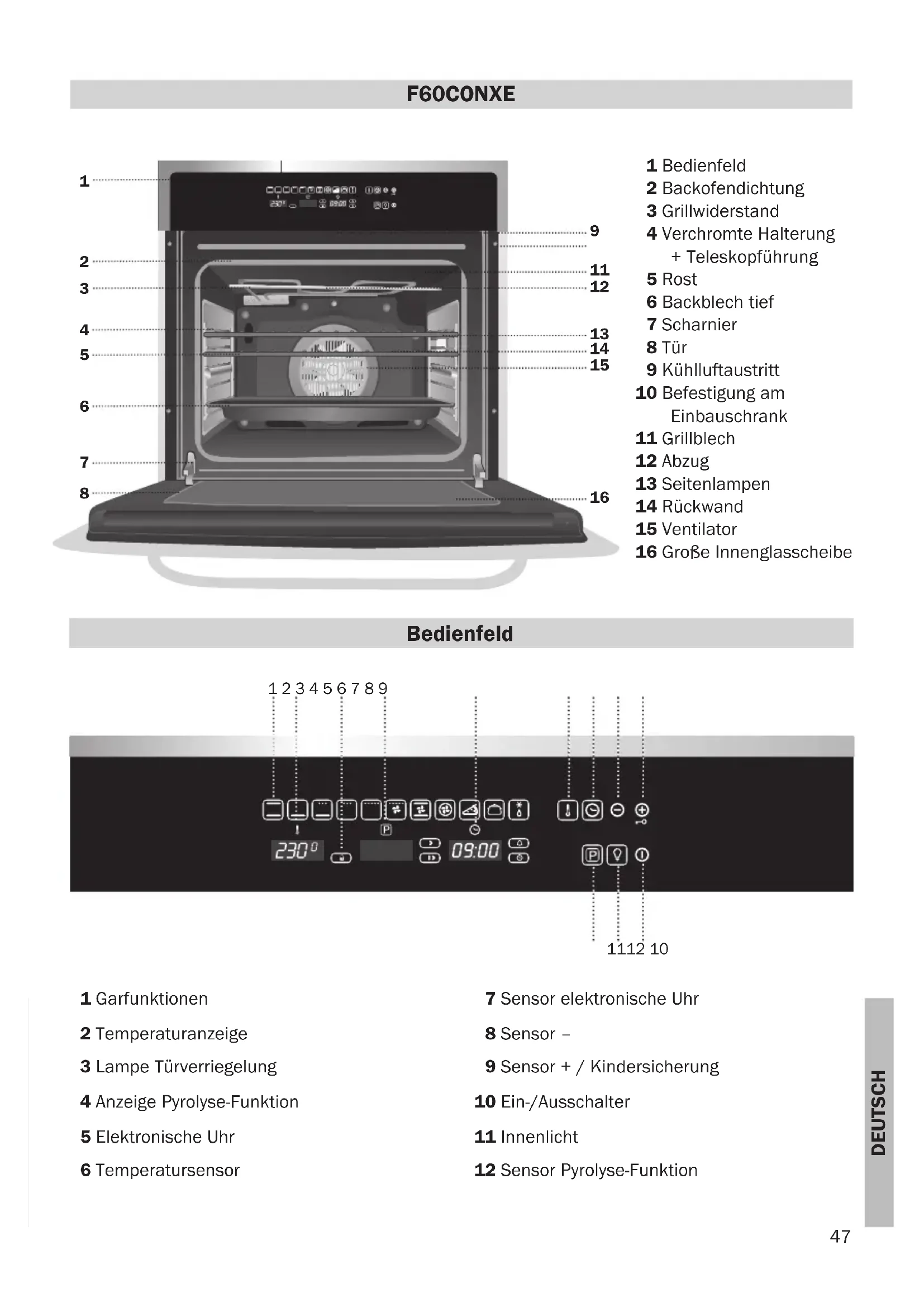 F60CONXE 11 Garfunktionen 12 Temperaturanzeige 13 Lampe Türverriegelung 14 Anzeige Pyrolyse-Funktion 15 Elektronische Uhr 16 Temperatursensor Bedienfeld 17 Sensor elektronische Uhr 18 Sensor – 19 Sensor + / Kindersicherung 10 Ein-/Ausschalter 11 Innenlicht 12 Sensor Pyrolyse-Funktion