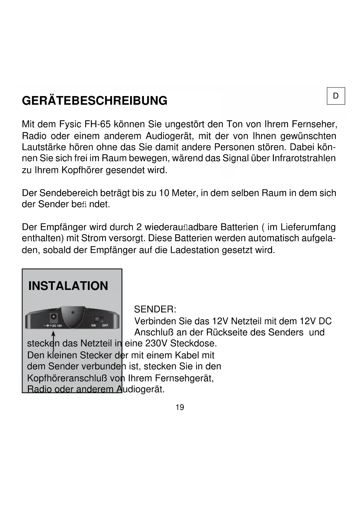 Mit dem Fysic FH-65 konnen Sie ungestört den Ton von ihren Fernseher, Radio oder einem anderen Audiogerät, mit der von ihren gewünschten Lautstärke horen ohne das Sie damit andere Personen stären. Dabei konnen Sie sich frei im Raum bewegen,wärend das Signal über Infrarotstrahlen zu ihrem Kopfhörer gesendet wird.