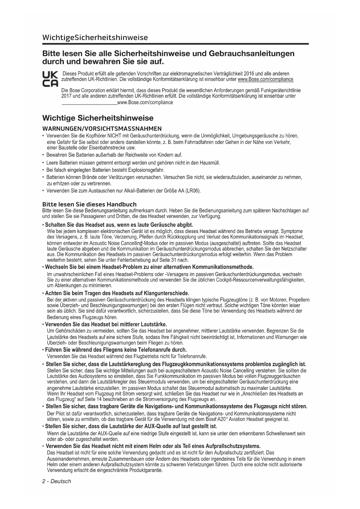 Bitte lesen Sie alle Sicherheitshinweise und Gebrauchsanleitungen durch und bewahren Sie sie auf. Dieses Produkt erfüllt alle geltenden Vorschriften zur elektromagnetischen Verträglichkeit 2016 und alle anderen zutreffenden UK-Richtlinien. Die vollständige Konformitätserklärung ist einsehbar unter www.Bose.com/compliancewww.Bose.com/compliance Die Bose Corporation erklärt hiermit, dass dieses Produkt die wesentlichen Anforderungen gemäß Funkgeräterichtlinie 2017 und alle anderen zutreffenden UK-Richtlinien erfüllt. Die vollständige Konformitätserklärung ist einsehbar unter www.Bose.com/compliancewww.Bose.com/compliance Wichtige Sicherheitshinweise WARNUNGEN/VORSICHTSMASSNAHMEN