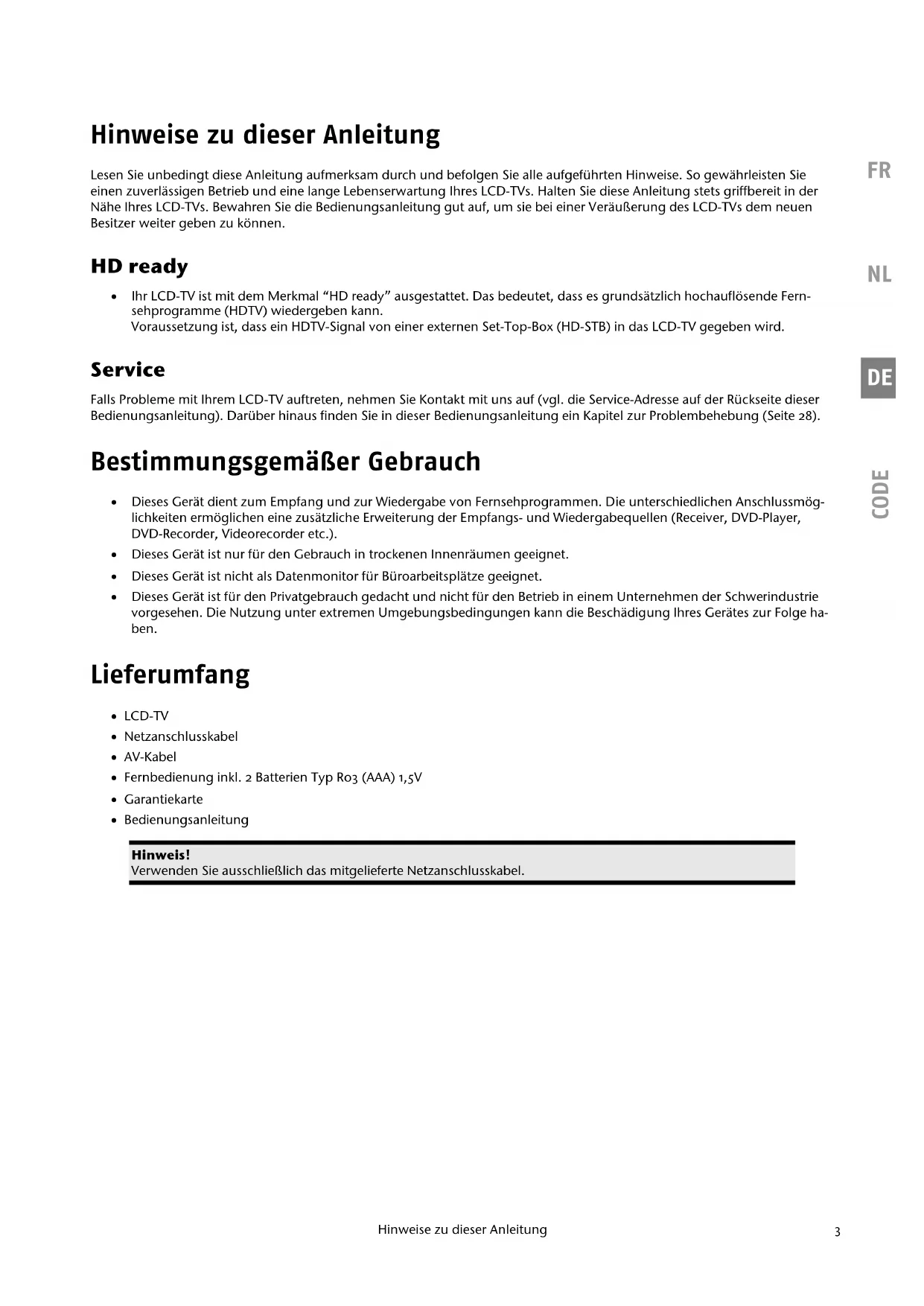 CODE Hinweise zu dieser Anleitung Lesen Sie unbedingt diese Anleitung aufmerksam durch und befolgen Sie alle aufgeführten Hinweise. So gewährleisten Sie einen zuverlässigen Betrieb und eine lange Lebenserwartung Ihres LCD-TVs. Halten Sie diese Anleitung stets griffbereit in der Nähe Ihres LCD-TVs. Bewahren Sie die Bedienungsanleitung gut auf, um sie bei einer Veräußerung des LCD-TVs dem neuen Besitzer weiter geben zu können. HD ready