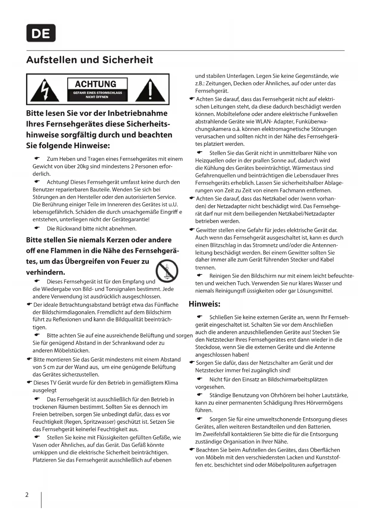 Aufstellen und Sicherheit Bitte lesen Sie vor der Inbetriebnahme Ihres Fernsehgerätes diese Sicherheits- hinweise sorgfältig durch und beachten Sie folgende Hinweise: Zum Heben und Tragen eines Fernsehgerätes mit einem Gewicht von über 20kg sind mindestens 2 Personen erfor-derlich. Achtung! Dieses Fernsehgerät umfasst keine durch den Benutzer reparierbaren Bauteile. Wenden Sie sich bei Störungen an den Hersteller oder den autorisierten Service. Die Berührung einiger Teile im Innereren des Gerätes ist u.U. lebensgefährlich. Schäden die durch unsachgemäße Eingri e entstehen, unterliegen nicht der Gerätegarantie! Die Rückwand bitte nicht abnehmen. Bitte stellen Sie niemals Kerzen oder andere o ene Flammen in die Nähe des Fernsehgerä- tes, um das Übergreifen von Feuer zu verhindern. Dieses Fernsehgerät ist für den Empfang und die Wiedergabe von Bild- und Tonsignalen bestimmt. Jede andere Verwendung ist ausdrücklich ausgeschlossen. Der ideale Betrachtungsabstand beträgt etwa das Fün ache der Bildschirmdiagonalen. Fremdlicht auf dem Bildschirm führt zu Re exionen und kann die Bildqualität beeinträch- tigen. Bitte achten Sie auf eine ausreichende Belüftung und sorgen Sie für genügend Abstand in der Schrankwand oder zu anderen Möbelstücken. Bitte montieren Sie das Gerät mindestens mit einem Abstand von 5 cm zur der Wand aus, um eine genügende Belüftung das Gerätes sicherzustellen. Dieses TV Gerät wurde für den Betrieb in gemäßigtem Klima ausgelegt Das Fernsehgerät ist ausschließlich für den Betrieb in trockenen Räumen bestimmt. Sollten Sie es dennoch im Freien betreiben, sorgen Sie unbedingt dafür, dass es vor Feuchtigkeit (Regen, Spritzwasser) geschützt ist. Setzen Sie das Fernsehgerät keinerlei Feuchtigkeit aus. Stellen Sie keine mit Flüssigkeiten gefüllten Gefäße, wie Vasen oder Ähnliches, auf das Gerät. Das Gefäß könnte umkippen und die elektrische Sicherheit beinträchtigen. Platzieren Sie das Fernsehgerät ausschließlich auf ebenen und stabilen Unterlagen. Legen Sie keine Gegenstände, wie z.B.: Zeitungen, Decken oder Ähnliches, auf oder unter das Fernsehgerät. Achten Sie darauf, dass das Fernsehgerät nicht auf elektri- schen Leitungen steht, da diese dadurch beschädigt werden können. Mobiltelefone oder andere elektrische Funkwellen abstrahlende Geräte wie WLAN- Adapter, Funküberwa-chungskamera o.ä. können elektromagnetische Störungen verursachen und sollten nicht in der Nähe des Fernsehgerä-tes platziert werden. Stellen Sie das Gerät nicht in unmittelbarer Nähe von Heizquellen oder in der prallen Sonne auf, dadurch wird die Kühlung des Gerätes beeinträchtigt. Wärmestaus sind Gefahrenquellen und beinträchtigen die Lebensdauer Ihres Fernsehgeräts erheblich. Lassen Sie sicherheitshalber Ablage-rungen von Zeit zu Zeit von einem Fachmann entfernen. Achten Sie darauf, dass das Netzkabel oder (wenn vorhan- den) der Netzadapter nicht beschädigt wird. Das Fernsehge-rät darf nur mit dem beiliegenden Netzkabel/Netzadapter betrieben werden. Gewitter stellen eine Gefahr für jedes elektrische Gerät dar. Auch wenn das Fernsehgerät ausgeschaltet ist, kann es durch einen Blitzschlag in das Stromnetz und/oder die Antennen-leitung beschädigt werden. Bei einem Gewitter sollten Sie daher immer alle zum Gerät führenden Stecker und Kabel trennen. Reinigen Sie den Bildschirm nur mit einem leicht befeuchte-ten und weichen Tuch. Verwenden Sie nur klares Wasser und niemals Reinigungs üssigkeiten oder gar Lösungsmittel. Hinweis: Schließen Sie keine externen Geräte an, wenn Ihr Fernseh-gerät eingeschaltet ist. Schalten Sie vor dem Anschließen auch die anderen anzuschließenden Geräte aus! Stecken Sie den Netzstecker Ihres Fernsehgerätes erst dann wieder in die Steckdose, wenn Sie die externen Geräte und die Antenne angeschlossen haben! Sorgen Sie dafür, dass der Netzschalter am Gerät und der Netzstecker immer frei zugänglich sind! Nicht für den Einsatz an Bildschirmarbeitsplätzenvorgesehen. Ständige Benutzung von Ohrhörern bei hoher Lautstärke, kann zu einer permanenten Schädigung Ihres Hörvermögens führen. Sorgen Sie für eine umweltschonende Entsorgung dieses Gerätes, allen weiteren Bestandteilen und den Batterien. Im Zweifelsfall kontaktieren Sie bitte die für die Entsorgung zuständige Organisation in Ihrer Nähe. Beachten Sie beim Aufstellen des Gerätes, dass Ober ächen von Möbeln mit den verschiedensten Lacken und Kunststof-fen etc. beschichtet sind oder Möbelpolituren aufgetragen ACHTUNG
