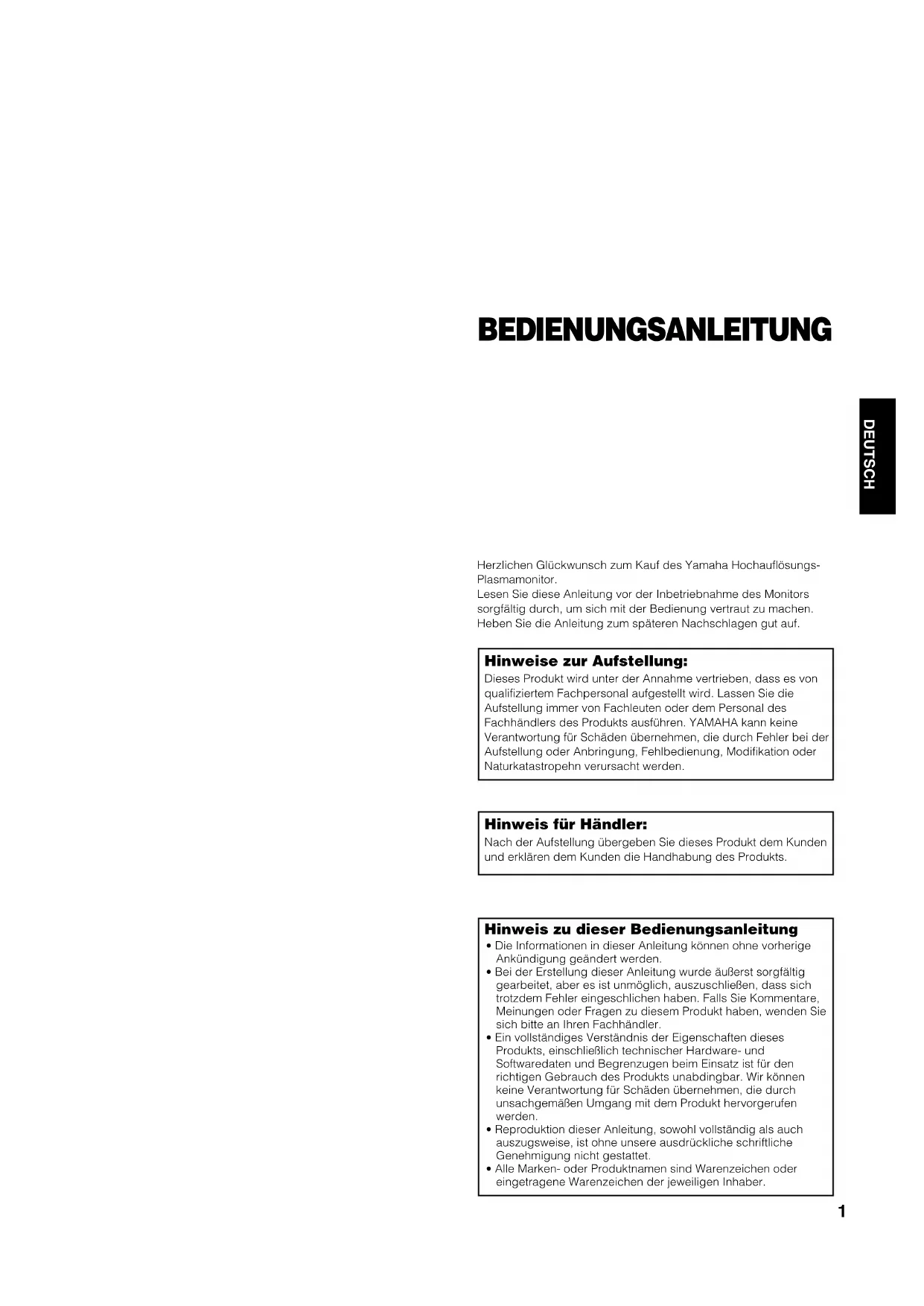 Herzlichen Glückwunsch zum Kauf des Yamaha Hochauflösungs-Plasmamonitor.