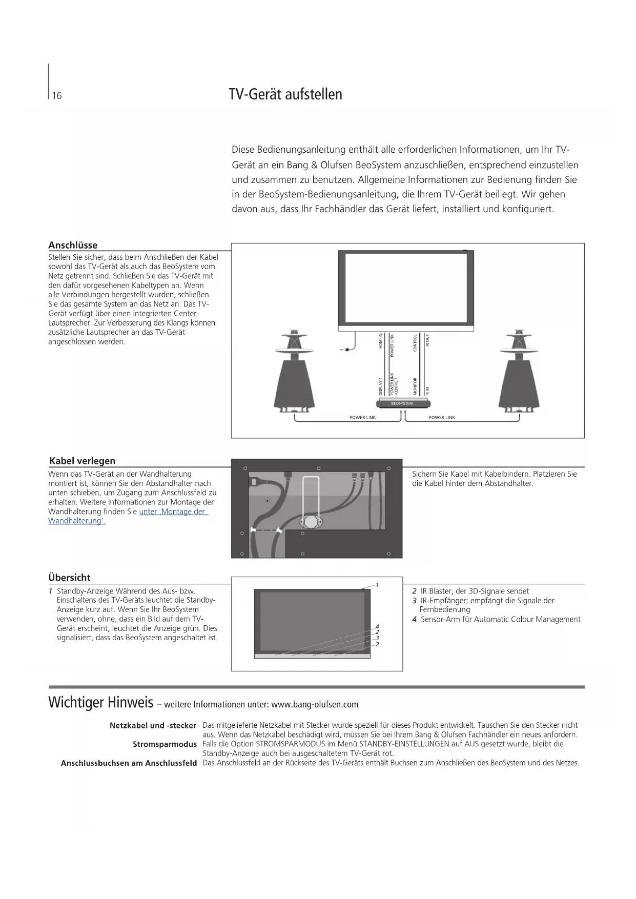 POWER LINKPOWER LINKHDMI INPOWER LINKIR OUTDISPLAY 1POWER LINK -CENTRE 1IR INCONTROLMONITORBEOSYSTEM 16Die regelmäßige Pege, wie z.B. die Reinigung, ist Aufgabe des Benutzers. Für beste Ergebnisse befolgen Sie die nachstehenden Hinweise. Das Automatic Colour Management kompensiert alle 100Betriebsstunden automatisch die Farbveränderungen. Pflege Vorsichtsmaßnahmen