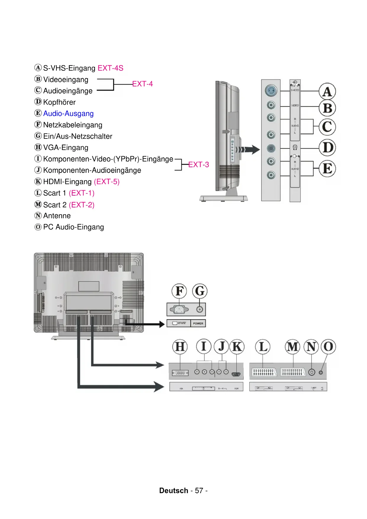 GRÜN = Menü Bild 03-ALM-26745W-1082 UK-17MB15 OEM-(VIRT DOLBY-HD READY)(PIP)-OZEL-50090220.p65 09.01.2007, 09:2955Deutsch - 56 - LCD TV VORDERSEITE RÜCKSEITE MENU - P/CH + TV/AV 03-ALM-26745W-1082 UK-17MB15 OEM-(VIRT DOLBY-HD READY)(PIP)-OZEL-50090220.p65 09.01.2007, 09:2956Deutsch - 57 - S-VHS-Eingang EXT-4S Videoeingang Audioeingänge Kopfhörer Audio-Ausgang Netzkabeleingang Ein/Aus-Netzschalter VGA-Eingang Komponenten-Video-(YPbPr)-Eingänge Komponenten-Audioeingänge HDMI-Eingang (EXT-5) Scart 1 (EXT-1) Scart 2 (EXT-2) Antenne PC Audio-Eingang EXT-4 EXT-3 220V-240V AC~50 Hz POWER 03-ALM-26745W-1082 UK-17MB15 OEM-(VIRT DOLBY-HD READY)(PIP)-OZEL-50090220.p65 09.01.2007, 09:2957Deutsch - 58 - Vorbereitung Halten S ie um das Fe r n se hgerä t mindestens 10 cm Abstand zu Möbeln etc. ein, um eine ausreichende Luftzirkulation zu gewährleisten. Vermeiden Sie gefährliche Situationen, indem Sie keine Gegenstände auf dem Gerät abstellen. Verwenden Sie dieses Gerät nur in gemäßigtem Klima. Eigenschaften