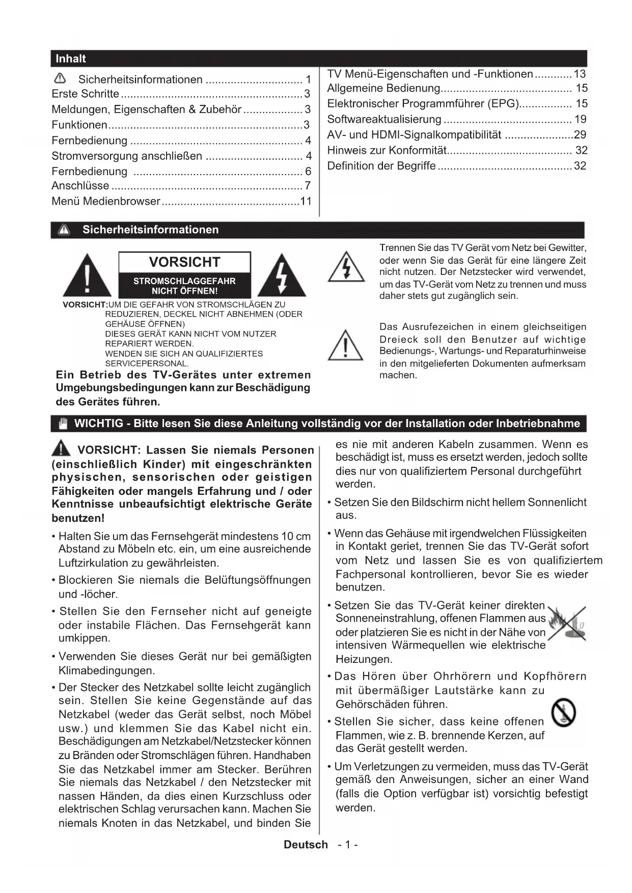 - Deutsch - 1 - Inhalt Sicherheitsinformationen VORSICHT: Lassen Sie niemals Personen (einschließlich Kinder) mit eingeschränkten physischen, sensorischen oder geistigen Fähigkeiten oder mangels Erfahrung und / oder Kenntnisse unbeaufsichtigt elektrische Geräte benutzen! Halten Sie um das Fernsehgerät mindestens 10 cm Abstand zu Möbeln etc. ein, um eine ausreichende Luftzirkulation zu gewährleisten. Blockieren Sie niemals die Belüftungsöffnungen und -löcher. Stellen Sie den Fernseher nicht auf geneigte oder instabile Flächen. Das Fernsehgerät kann umkippen. Verwenden Sie dieses Gerät nur bei gemäßigten Klimabedingungen. Der Stecker des Netzkabel sollte leicht zugänglich sein. Stellen Sie keine Gegenstände auf das Netzkabel (weder das Gerät selbst, noch Möbel usw.) und klemmen Sie das Kabel nicht ein. Beschädigungen am Netzkabel/Netzstecker können zu Bränden oder Stromschlägen führen. Handhaben Sie das Netzkabel immer am Stecker. Berühren Sie niemals das Netzkabel / den Netzstecker mit nassen Händen, da dies einen Kurzschluss oder elektrischen Schlag verursachen kann. Machen Sie niemals Knoten in das Netzkabel, und binden Sie WICHTIG - Bitte lesen Sie diese Anleitung vollständig vor der Installation oder Inbetriebnahme Sicherheitsinformationen p. 1