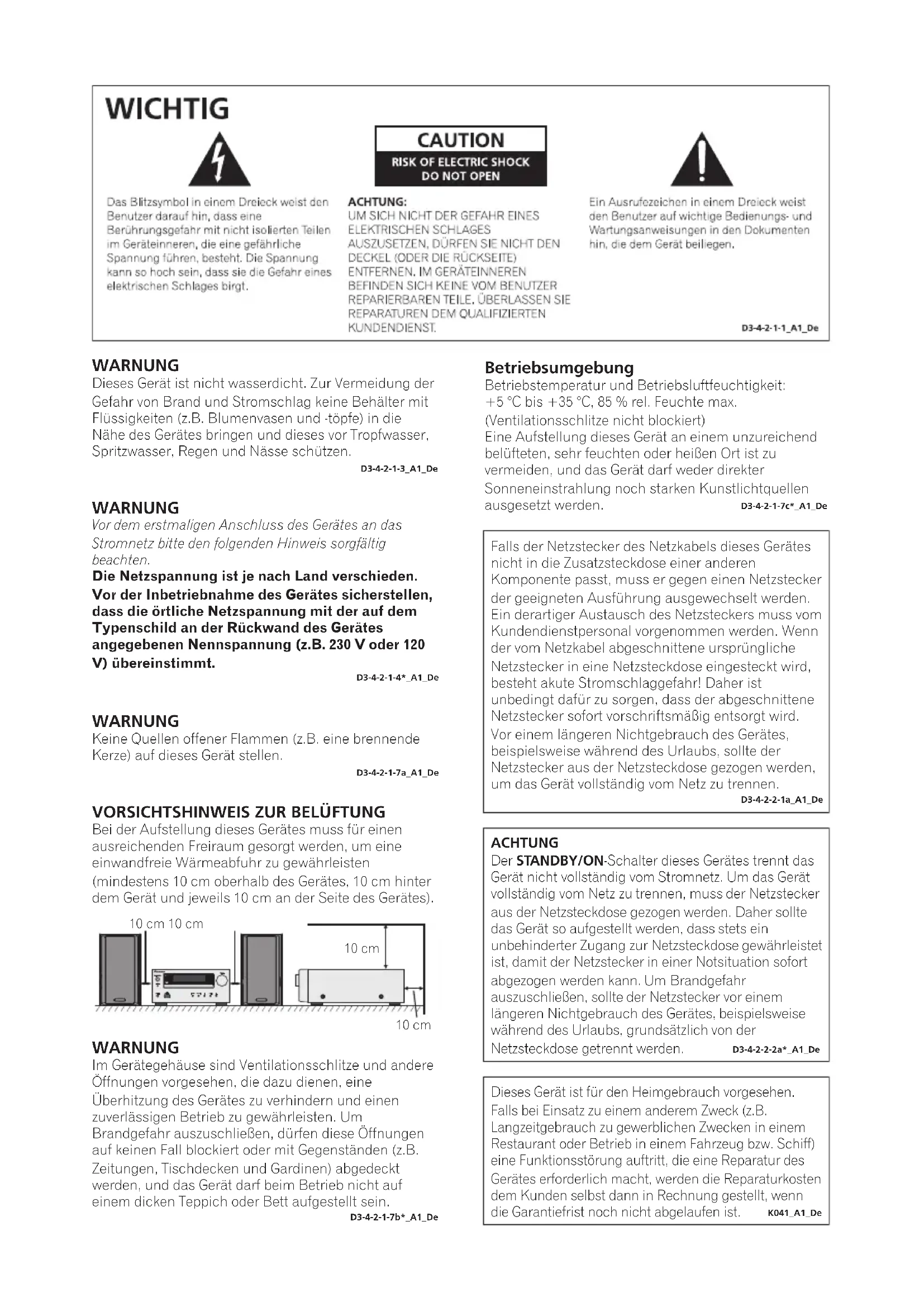 WARNUNG Dieses Gerät ist nicht wasserdicht. Zur Vermeidung der Gefahr von Brand und Stromschlag keine Behälter mit Flüssigkeiten (z.B. Blumenvasen und -töpfe) in die Nähe des Gerätes bringen und dieses vor Tropfwasser,Spritzwasser, Regen und Nässe schützen.D3-4-2-1-3_A1_De WARNUNG Vor dem erstmaligen Anschluss des Gerätes an das Stromnetz bitte den folgenden Hinweis sorgfältigbeachten.Die Netzspannung ist je nach Land verschieden.Vor der Inbetriebnahme des Gerätes sicherstellen, dass die örtliche Netzspannung mit der auf demTypenschild an der Rückwand des Gerätesangegebenen Nennspannung (z.B. 230 V oder 120 V) übereinstimmt.D3-4-2-1-4*_A1_De WARNUNG Keine Quellen offener Flammen (z.B. eine brennendeKerze) auf dieses Gerät stellen.D3-4-2-1-7a_A1_De