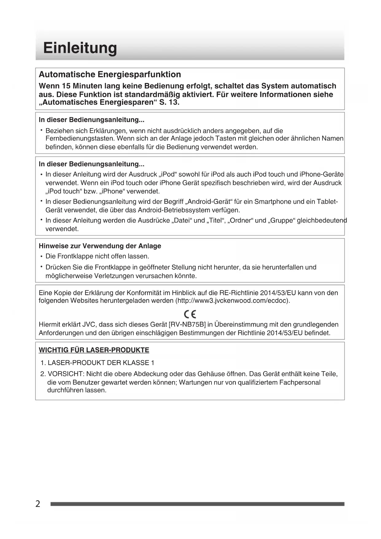 Drücken Sie die Frontklappe in geöffneter Stellung nicht herunter, da sie herunterfallen und möglicherweise Verletzungen verursachen könnte. Eine Kopie der Erklärung der Konformität im Hinblick auf die RE-Richtlinie 2014/53/EU kann von den folgenden Websites heruntergeladen werden (http://www3.jvckenwood.com/ecdoc). Hiermit erklärt JVC, dass sich dieses Gerät [RV-NB75B] in Übereinstimmung mit den grundlegenden Anforderungen und den übrigen einschlägigen Bestimmungen der Richtlinie 2014/53/EU befindet.