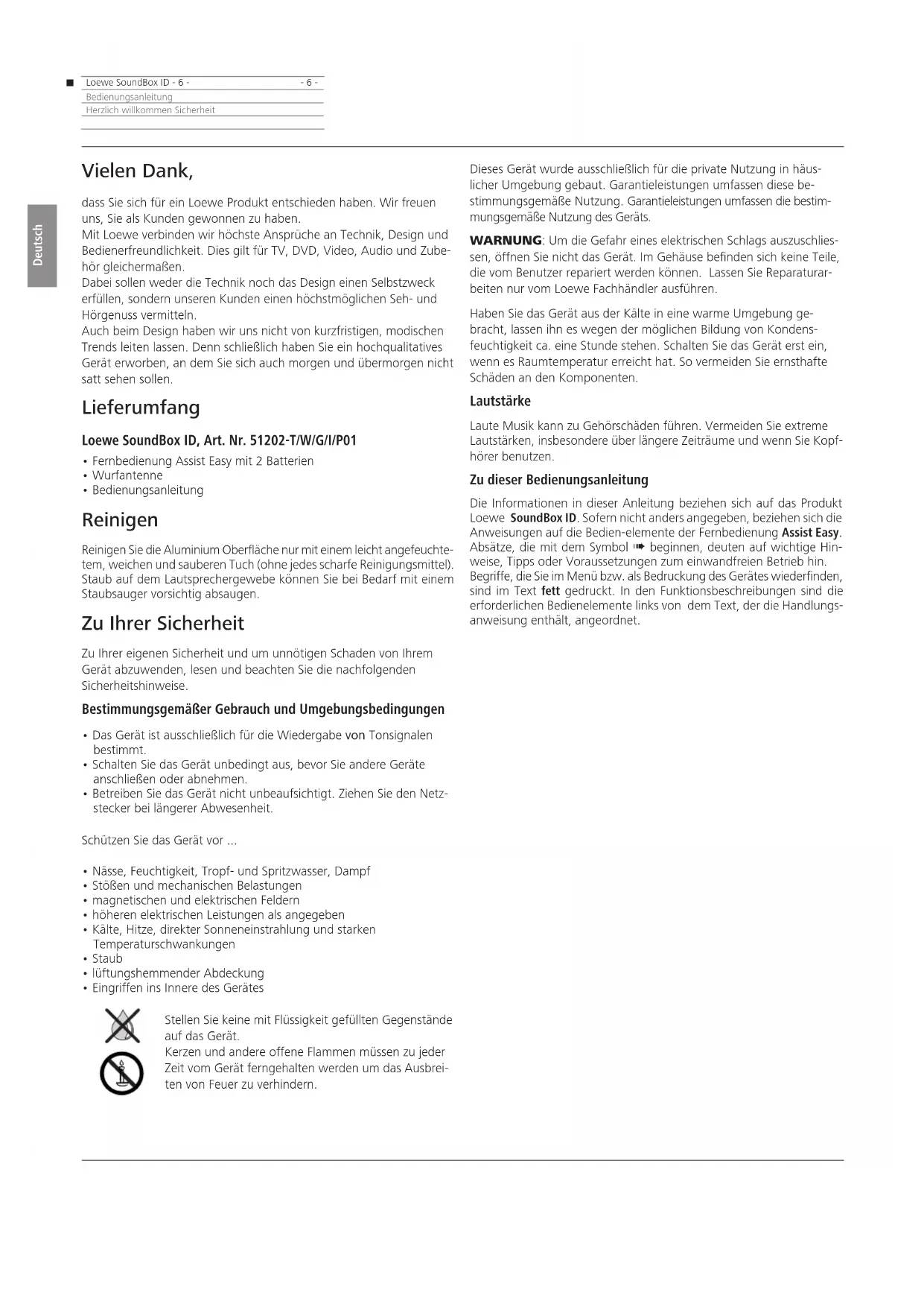 - Eingriffen ins Innere des Gerätes Stellen Sie keine mit Flüssigkeit gefüllten Gegenstände auf das Gerät. Kerzen und andere offene Flammen müssen zu jeder Zeit vom Gerät ferngehalten werden um das Ausbrei- ten von Feuer zu verhindern. Dieses Gerät wurde ausschließlich für die private Nutzung in häus- licher Umgebung gebaut. Garantieleistungen umfassen diese be- stimmungsgemäße Nutzung. Garantieleistungen umfassen die bestim- mungsgemäße Nutzung des Geräts. WARNUNG: Um die Gefahr eines elektrischen Schlags auszuschlies- sen, öffnen Sie nicht das Gerät. Im Gehäuse benden sich keine Teile, die vom Benutzer repariert werden können. Lassen Sie Reparaturar- beiten nur vom Loewe Fachhändler ausführen. Haben Sie das Gerät aus der Kälte in eine warme Umgebung ge- bracht, lassen ihn es wegen der möglichen Bildung von Kondens- feuchtigkeit ca. eine Stunde stehen. Schalten Sie das Gerät erst ein, wenn es Raumtemperatur erreicht hat. So vermeiden Sie ernsthafte Schäden an den Komponenten. Lautstärke Laute Musik kann zu Gehörschäden führen. Vermeiden Sie extreme Lautstärken, insbesondere über längere Zeiträume und wenn Sie Kopf- hörer benutzen. Zu dieser Bedienungsanleitung Die Informationen in dieser Anleitung beziehen sich auf das Produkt Loewe SoundBox ID. Sofern nicht anders angegeben, beziehen sich die Anweisungen auf die Bedien-elemente der Fernbedienung Assist Easy. Absätze, die mit dem Symbol ➠ beginnen, deuten auf wichtige Hin- weise, Tipps oder Voraussetzungen zum einwandfreien Betrieb hin. Begriffe, die Sie im Menü bzw. als Bedruckung des Gerätes wiederfinden, sind im Text fett gedruckt. In den Funktionsbeschreibungen sind die erforderlichen Bedienelemente links von dem Text, der die Handlungs- anweisung enthält, angeordnet.n Loewe SoundBox ID - 7 - Deutsch English Français Italiano Español Nederlands DanskSuomi Svenska