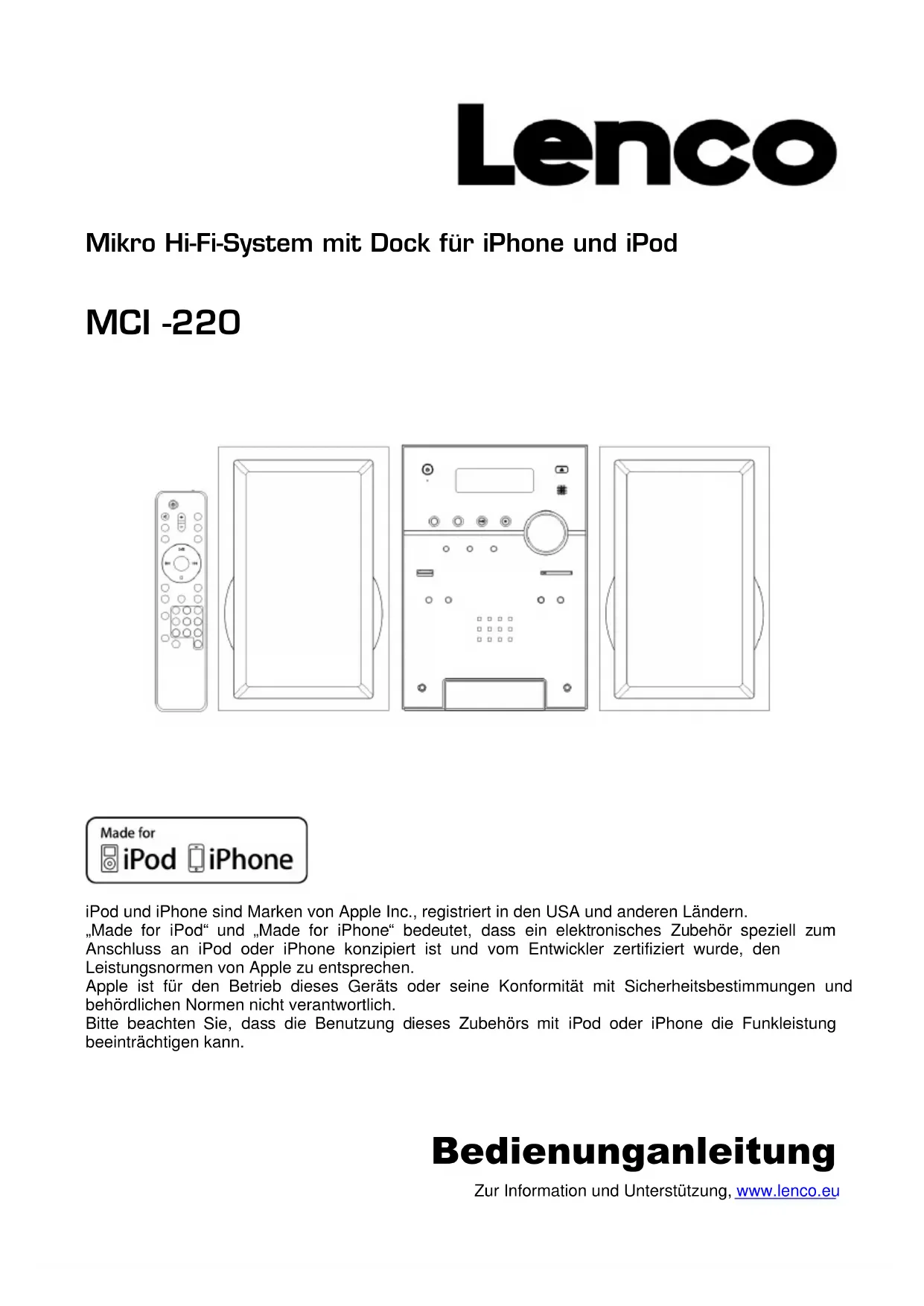 Finden Sie kostenlos die Bedienungsanleitung des Geräts MCI220 LENCO als PDF.