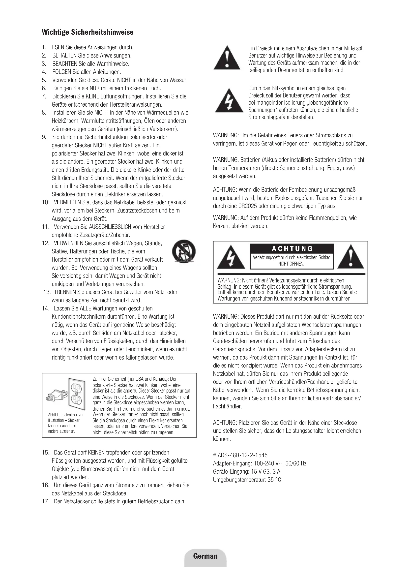 WARNUNG: Dieses Produkt darf nur mit den auf der Rückseite oder dem eingebauten Netzteil aufgelisteten Wechselstromspannungen betrieben werden. Ein Betrieb mit anderen Spannungen kann Geräteschäden hervorrufen und führt zum Erlöschen des Garantieanspruchs. Vor dem Einsatz von Adaptersteckern ist zu warnen, da das Produkt dann mit Spannungen in Kontakt ist, für die es nicht konzipiert wurde. Wenn das Produkt ein abnehmbares Netzkabel hat, dürfen Sie nur das Ihrem Produkt beiliegende oder von Ihrem örtlichen Vertriebshändler/Fachhändler gelieferte Kabel verwenden. Wenn Sie die korrekte Betriebsspannung nicht kennen, wenden Sie sich bitte an Ihren örtlichen Vertriebshändler/ Fachhändler. ACHTUNG: Platzieren Sie das Gerät in der Nähe einer Steckdose und stellen Sie sicher, dass den Leistungsschalter leicht erreichen können.