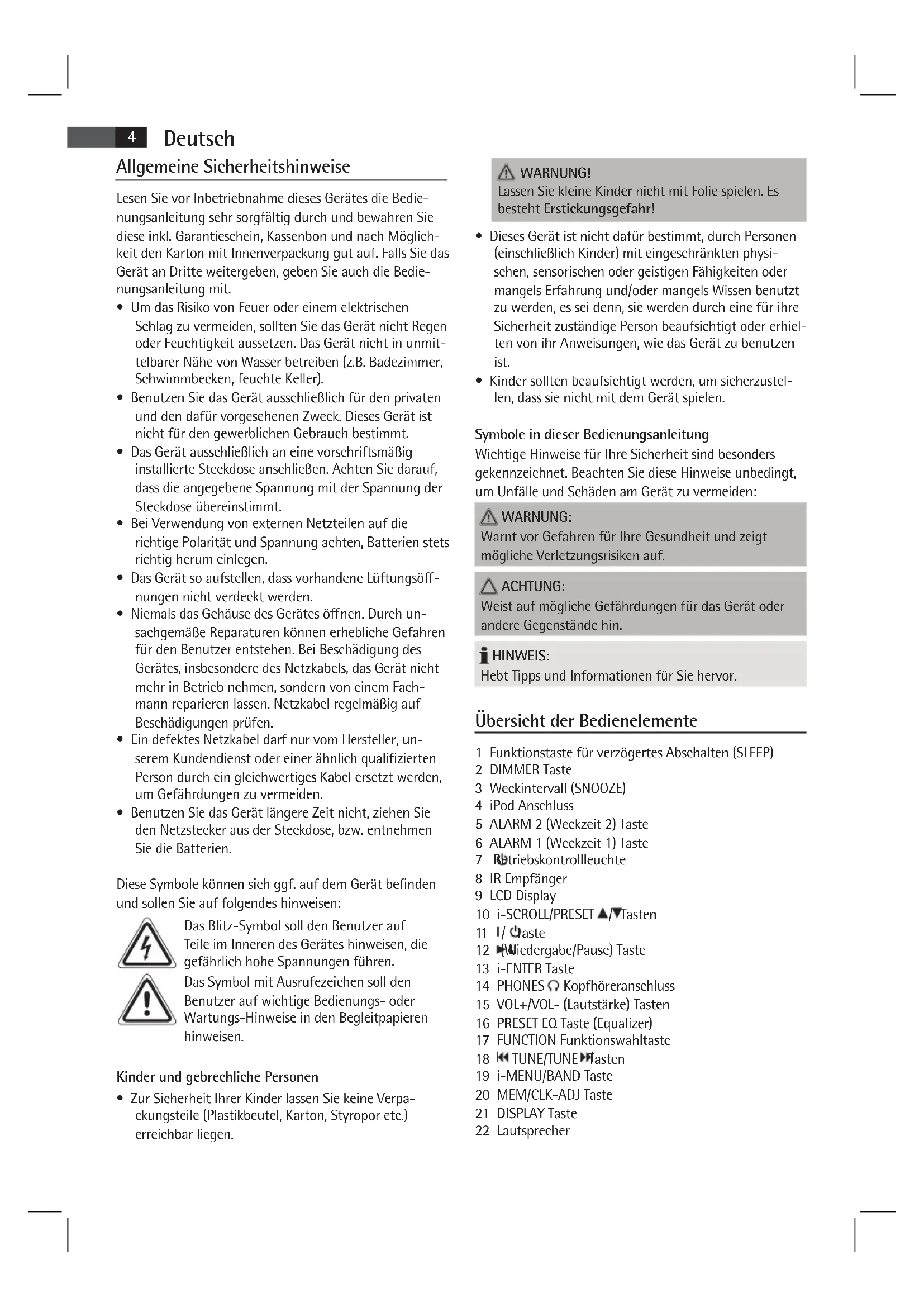 - Kinder sollten beaufsichtigt werden, um sicherzustel- len, dass sie nicht mit dem Gerät spielen. Symbole in dieser Bedienungsanleitung Wichtige Hinweise für Ihre Sicherheit sind besonders gekennzeichnet. Beachten Sie diese Hinweise unbedingt, um Unfälle und Schäden am Gerät zu vermeiden: WARNUNG: Warnt vor Gefahren für Ihre Gesundheit und zeigt mögliche Verletzungsrisiken auf. ACHTUNG: Weist auf mögliche Gefährdungen für das Gerät oder andere Gegenstände hin. HINWEIS: Hebt Tipps und Informationen für Sie hervor. Übersicht der Bedienelemente 1 Funktionstaste für verzögertes Abschalten (SLEEP) 2 DIMMER Taste 3 Weckintervall (SNOOZE) 4 iPod Anschluss 5 ALARM 2 (Weckzeit 2) Taste 6 ALARM 1 (Weckzeit 1) Taste 7 Betriebskontrollleuchte 8 IR Empfänger 9 LCD Display 10 i-SCROLL/PRESET / Tasten