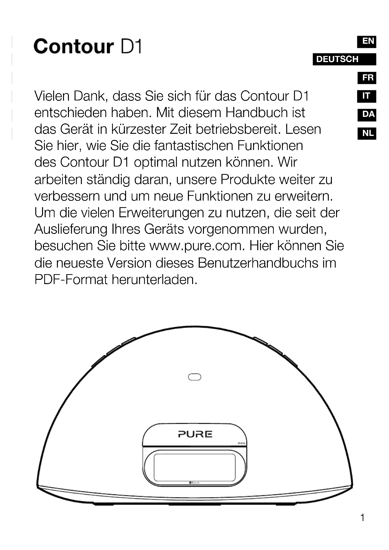 Vielen Dank, dass Sie sich für das Contour D1 entschieden haben. Mit diesem Handbuch ist das Gerät in kürzester Zeit betriebsbereit. Lesen Sie hier, wie Sie die fantastischen Funktionen des Contour D1 optimal nutzen können. Wir arbeiten ständig daran, unsere Produkte weiter zu verbessern und um neue Funktionen zu erweitern. Um die vielen Erweiterungen zu nutzen, die seit der Auslieferung Ihres Geräts vorgenommen wurden, besuchen Sie bitte www.pure.com. Hier können Sie die neueste Version dieses Benutzerhandbuchs im PDF-Format herunterladen.2 Sicherheitshinweise