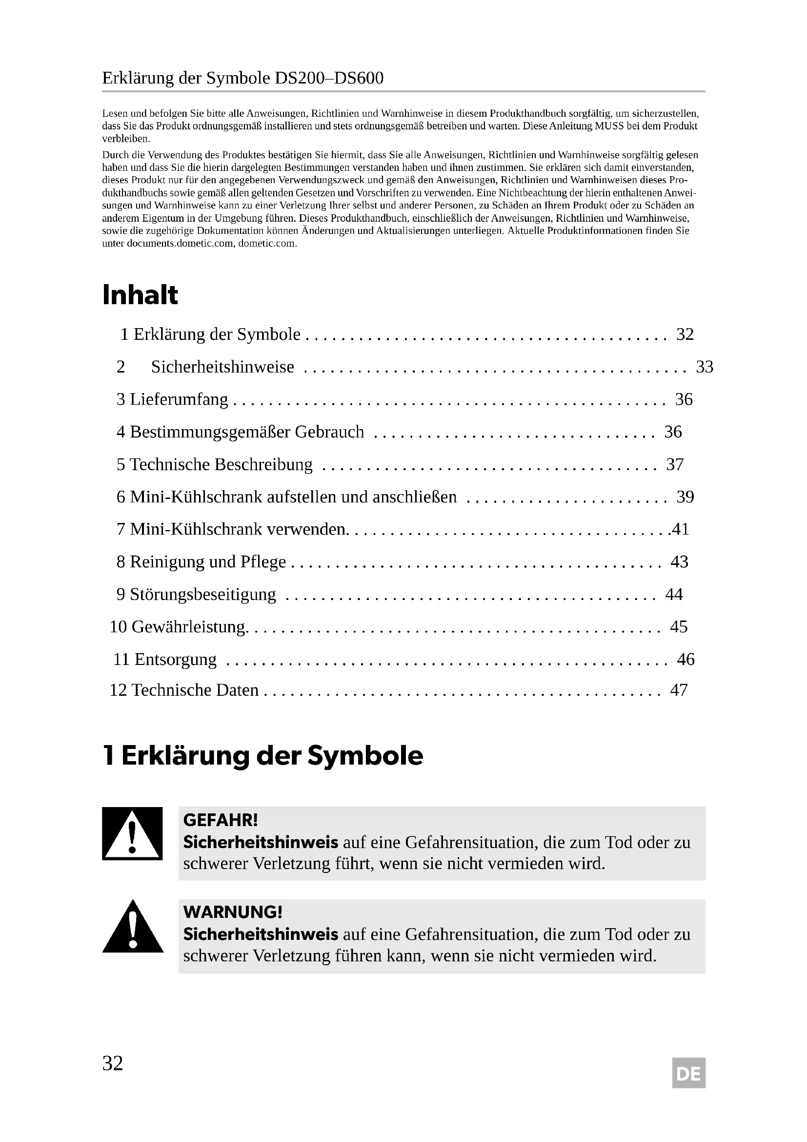 GEFAHR! Sicherheitshinweis auf eine Gefahrensituation, die zum Tod oder zu schwerer Verletzung führt, wenn sie nicht vermieden wird. WARNUNG! Sicherheitshinweis auf eine Gefahrensituation, die zum Tod oder zu schwerer Verletzung führen kann, wenn sie nicht vermieden wird. DometicDS200-300-400-600_IOM_4445103315_EMEA16_2020-xx-xx.book Seite 32 Mittwoch, 3. März 2021 11:36 11DE DS200–DS600 Sicherheitshinweise