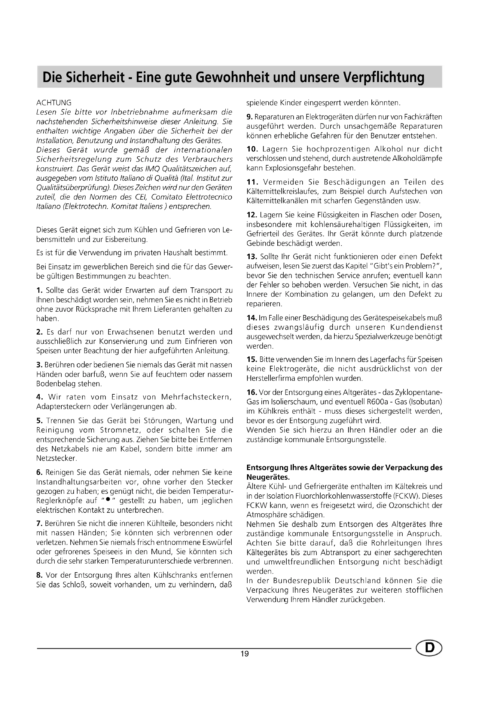 Die Sicherheit - Eine gute Gewohnheit und unsere Verpflichtung ACHTUNG Lesen Sie bitte vor Inbetriebnahme aufmerksam die nachstehenden Sicherheitshinweise dieser Anleitung. Sie enthalten wichtige Angaben über die Sicherheit bei der Installation, Benutzung und Instandhaltung des Gerätes. Dieses Gerät wurde gemäß der internationalen Sicherheitsregelung zum Schutz des Verbrauchers konstruiert. Das Gerät weist das IMQ Qualitätszeichen auf, ausgegeben vom Istituto Italiano di Qualità (Ital. Institut zur Qualitätsüberprüfung). Dieses Zeichen wird nur den Geräten zuteil, die den Normen des CEI, Comitato Elettrotecnico Italiano (Elektrotechn. Komitat Italiens ) entsprechen. Dieses Gerät eignet sich zum Kühlen und Gefrieren von Le- bensmitteln und zur Eisbereitung. Es ist für die Verwendung im privaten Haushalt bestimmt. Bei Einsatz im gewerblichen Bereich sind die für das Gewer- be gültigen Bestimmungen zu beachten.