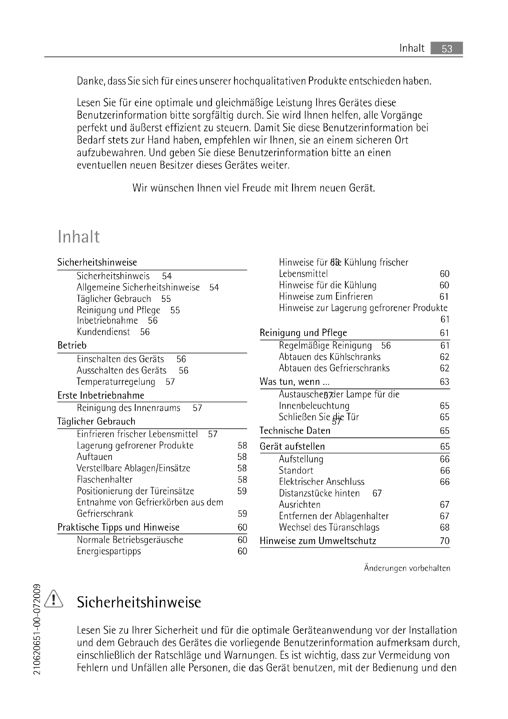 En matière de sauvegarde de l'environnementDanke, dass Sie sich für eines unserer hochqualitativen Produkte entschieden haben. Lesen Sie für eine optimale und gleichmäßige Leistung Ihres Gerätes diese Benutzerinformation bitte sorgfältig durch. Sie wird Ihnen helfen, alle Vorgänge perfekt und äußerst effizient zu steuern. Damit Sie diese Benutzerinformation bei Bedarf stets zur Hand haben, empfehlen wir Ihnen, sie an einem sicheren Ort aufzubewahren. Und geben Sie diese Benutzerinformation bitte an einen eventuellen neuen Besitzer dieses Gerätes weiter. Wir wünschen Ihnen viel Freude mit Ihrem neuen Gerät. Inhalt Sicherheitshinweise 53 Sicherheitshinweis 54 Allgemeine Sicherheitshinweise 54 Täglicher Gebrauch 55 Reinigung und Pflege 55 Inbetriebnahme 56 Kundendienst 56 Betrieb 56 Einschalten des Geräts 56 Ausschalten des Geräts 56 Temperaturregelung 57 Erste Inbetriebnahme 57 Reinigung des Innenraums 57 Täglicher Gebrauch 57 Einfrieren frischer Lebensmittel 57 Lagerung gefrorener Produkte 58 Auftauen 58 Verstellbare Ablagen/Einsätze 58 Flaschenhalter 58 Positionierung der Türeinsätze 59 Entnahme von Gefrierkörben aus dem Gefrierschrank 59 Praktische Tipps und Hinweise 60 Normale Betriebsgeräusche 60 Energiespartipps 60 Hinweise für die Kühlung frischer Lebensmittel 60 Hinweise für die Kühlung 60 Hinweise zum Einfrieren 61 Hinweise zur Lagerung gefrorener Produkte