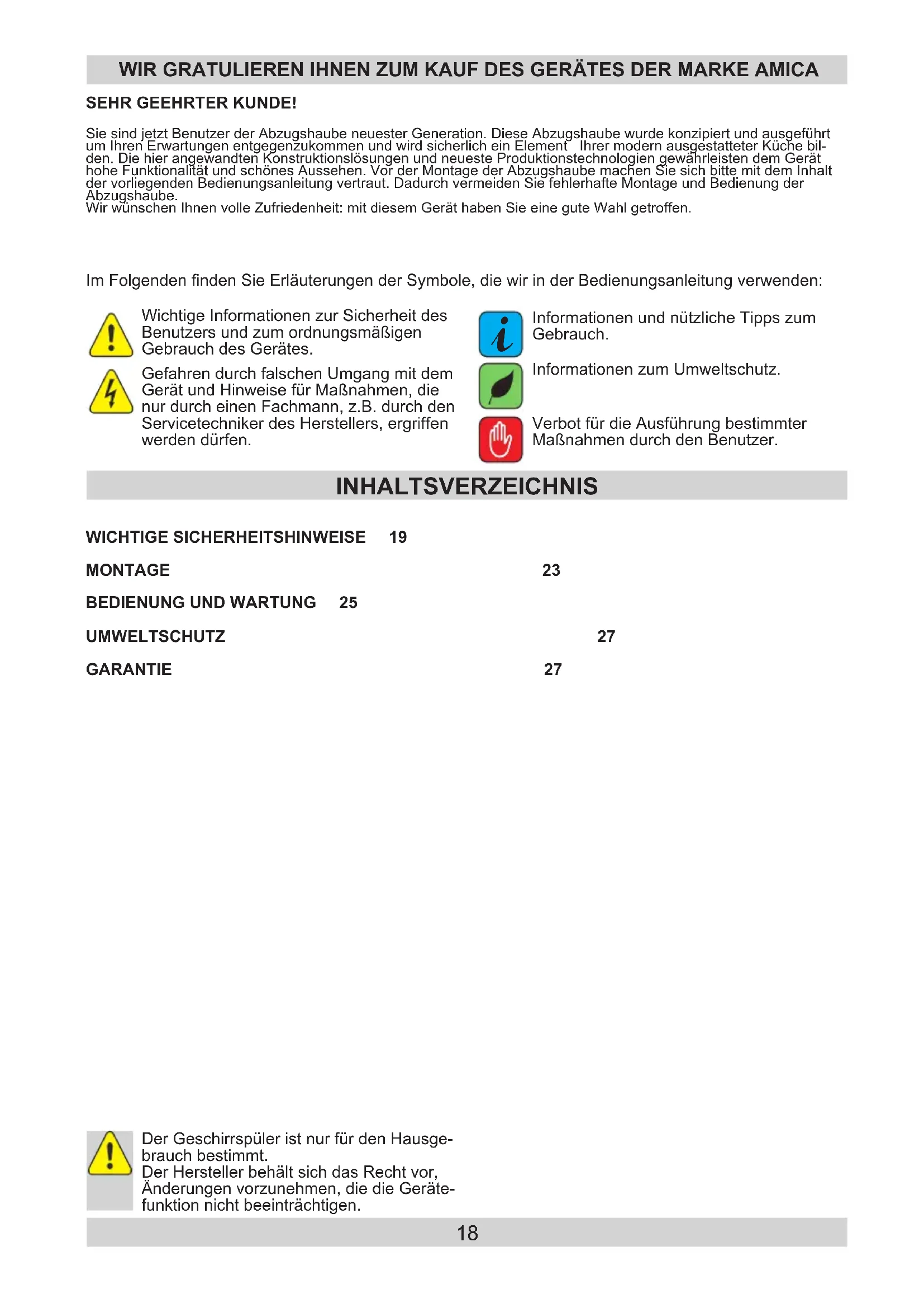 INHALTSVERZEICHNIS SEHR GEEHRTER KUNDE! Sie sind jetzt Benutzer der Abzugshaube neuester Generation. Diese Abzugshaube wurde konzipiert und ausgeführt um Ihren Erwartungen entgegenzukommen und wird sicherlich ein Element Ihrer modern ausgestatteter Küche bil-den. Die hier angewandten Konstruktionslösungen und neueste Produktionstechnologien gewährleisten dem Gerät hohe Funktionalität und schönes Aussehen. Vor der Montage der Abzugshaube machen Sie sich bitte mit dem Inhalt der vorliegenden Bedienungsanleitung vertraut. Dadurch vermeiden Sie fehlerhafte Montage und Bedienung der Abzugshaube.Wir wünschen Ihnen volle Zufriedenheit: mit diesem Gerät haben Sie eine gute Wahl getroffen. WIR GRATULIEREN IHNEN ZUM KAUF DES GERÄTES DER MARKE AMICA WICHTIGE SICHERHEITSHINWEISE 19 MONTAGE 23