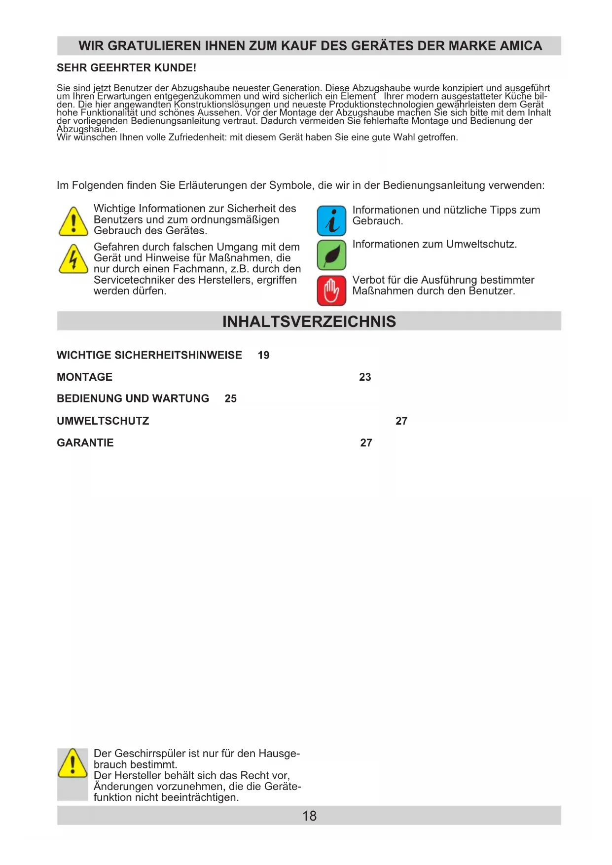 INHALTSVERZEICHNIS SEHR GEEHRTER KUNDE! Sie sind jetzt Benutzer der Abzugshaube neuester Generation. Diese Abzugshaube wurde konzipiert und ausgeführt um Ihren Erwartungen entgegenzukommen und wird sicherlich ein Element Ihrer modern ausgestatteter Küche bil-den. Die hier angewandten Konstruktionslösungen und neueste Produktionstechnologien gewährleisten dem Gerät hohe Funktionalität und schönes Aussehen. Vor der Montage der Abzugshaube machen Sie sich bitte mit dem Inhalt der vorliegenden Bedienungsanleitung vertraut. Dadurch vermeiden Sie fehlerhafte Montage und Bedienung der Abzugshaube.Wir wünschen Ihnen volle Zufriedenheit: mit diesem Gerät haben Sie eine gute Wahl getroffen. WIR GRATULIEREN IHNEN ZUM KAUF DES GERÄTES DER MARKE AMICA WICHTIGE SICHERHEITSHINWEISE 19 MONTAGE 23