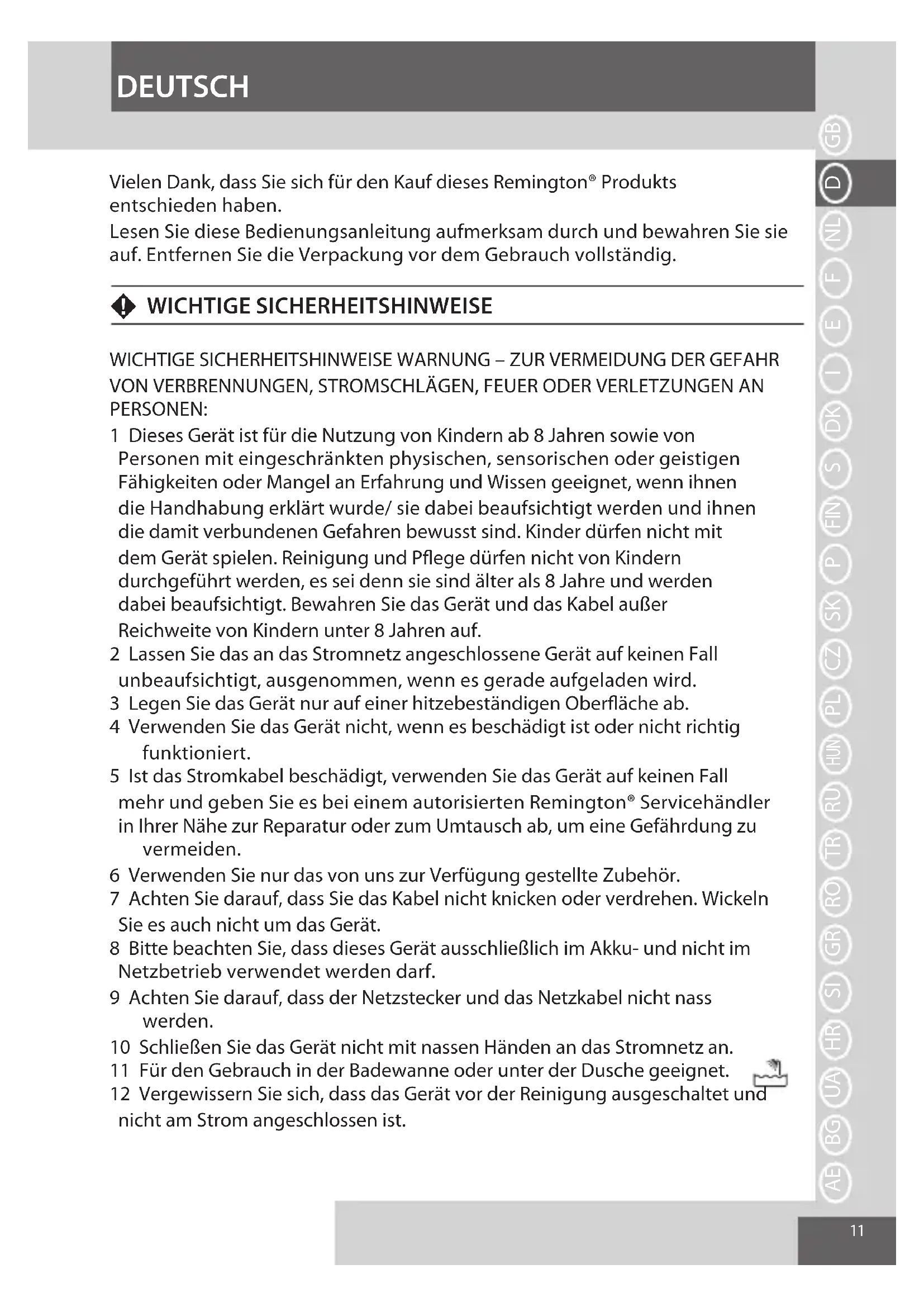 To avoid environmental and health problems due to hazardous substances in electrical and electronic goods, appliances marked with this symbol must not be disposed of with unsorted municipal waste, but recovered, reused or recycled. ENGLISH11 Vielen Dank, dass Sie sich für den Kauf dieses Remington® Produkts entschieden haben. Lesen Sie diese Bedienungsanleitung aufmerksam durch und bewahren Sie sie auf. Entfernen Sie die Verpackung vor dem Gebrauch vollständig.