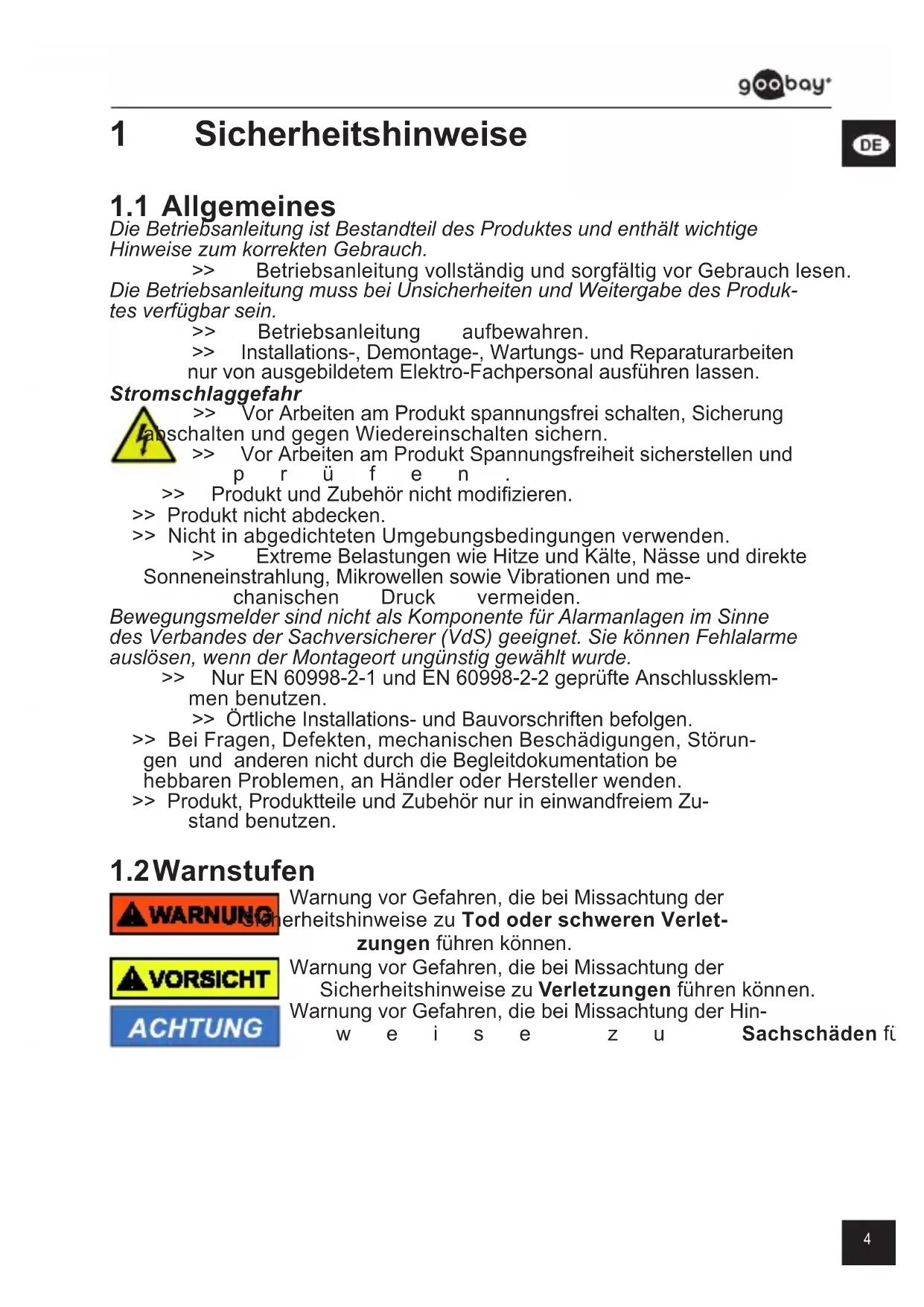 Die Betriebsanleitung ist Bestandteil des Produktes und enthält wichtige Hinweise zum korrekten Gebrauch. >> Betriebsanleitung vollständig und sorgfältig vor Gebrauch lesen. Die Betriebsanleitung muss bei Unsicherheiten und Weitergabe des Produk- tes verfügbar sein. >> Betriebsanleitung aufbewahren. >> Installations-,Demontage-,Wartungs-undReparaturarbeiten nurvonausgebildetemElektro-Fachpersonalausführenlassen. Stromschlaggefahr >> VorArbeitenamProduktspannungsfreischalten,Sicherung abschalten und gegen Wiedereinschalten sichern. >> VorArbeitenamProduktSpannungsfreiheitsicherstellenund prüfen. >> ProduktundZubehörnichtmodizieren. >> Produkt nicht abdecken. >> Nicht in abgedichteten Umgebungsbedingungen verwenden. >> ExtremeBelastungenwieHitzeundKälte,Nässeunddirekte Sonneneinstrahlung, Mikrowellen sowie Vibrationen und me- chanischen Druck vermeiden. Bewegungsmelder sind nicht als Komponente für Alarmanlagen im Sinne des Verbandes der Sachversicherer (VdS) geeignet. Sie können Fehlalarme auslösen, wenn der Montageort ungünstig gewählt wurde. >> NurEN60998-2-1undEN60998-2-2geprüfteAnschlussklem- menbenutzen. >> Örtliche Installations- und Bauvorschriften befolgen. >> Bei Fragen, Defekten, mechanischen Beschädigungen, Störun- gen und anderen nicht durch die Begleitdokumentation be hebbaren Problemen, an Händler oder Hersteller wenden. >> Produkt, Produktteile und Zubehör nur in einwandfreiem Zu- standbenutzen.