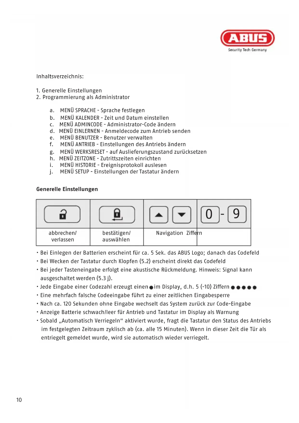 - Bei Einlegen der Batterien erscheint für ca. 5 Sek. das ABUS Logo; danach das Codefeld