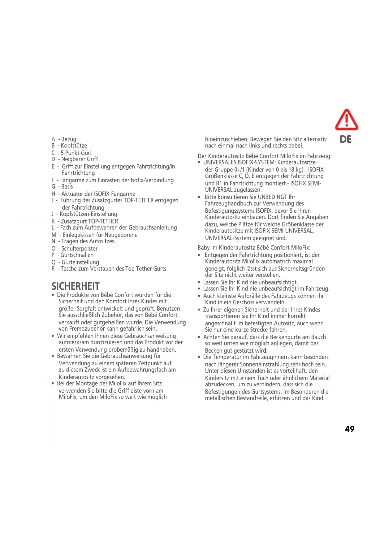 - Bewahren Sie die Gebrauchsanweisung für Verwendung zu einem späteren Zeitpunkt auf, zu diesem Zweck ist ein Aufbewahrungsfach am Kinderautositz vorgesehen.