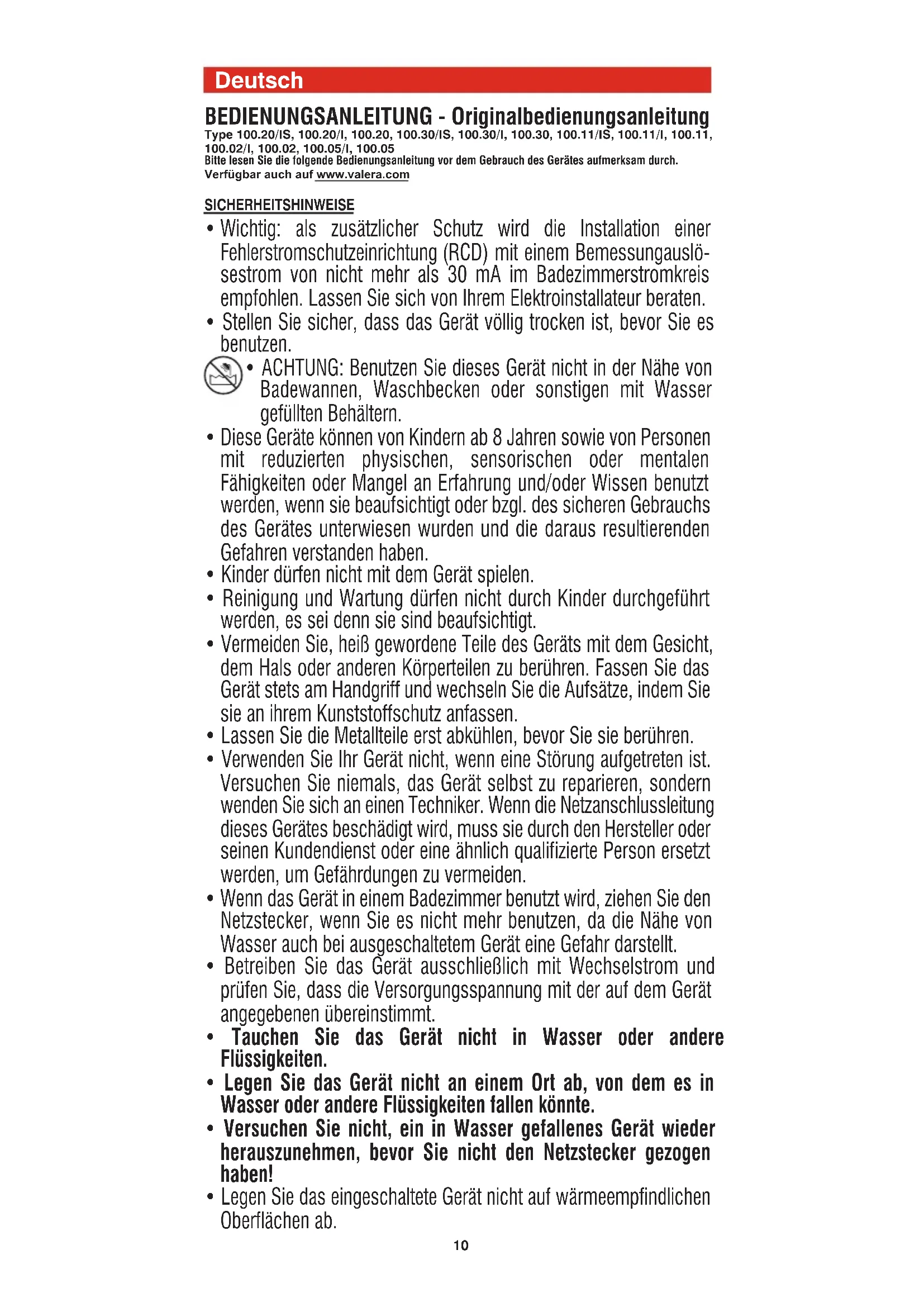 Abschalten des Gerätes gespeichert und wird bei der nächsten Einschaltung direkt angewählt. FUNKTION ION (nur Mod. 100.20/IS, 100.20/I, 100.30/IS, 100.30/I, 100.11/IS, 100.11/I, 100.02/I, 100.05/I) Dieses Gerät verfügt über eine Ionenfunktion die bei eingeschaltetem Gerät immer aktiv ist und einen negativen Ionenstrom erzeugt. Ein leichtes Brummen des Ionen-Generators ist eine normale Erscheinung. Was sind Ionen? Ionen sind in der Natur vorhandene elektrisch geladene Teilchen. Die negativ geladenen Ionen helfen die Luft zu reinigen, indem sie die positiv geladenen Ionen unwirksam machen. Positiv geladene Ionen dagegen halten den grössten Teil der sich in der Luft befindenden Schmutzteilchen und tragen deshalb zur Luftversch- mutzung bei. Eine grosse Menge von Ionen mit negativer Ladung gibt es nach einem Gewitter, sowie am Meer oder in den Bergen, in der Nähe von Wasserfällen und Wasserläufen, wo man sich wohl fühlt, weil dort die Luft reiner, natürlicher und erfrischender ist. Idealer Feuchtigkeitszustand der Haare Negativ geladene Ionen helfen, dass die Haare ihren lebensnotwendigen Feuchtigkeitsgrad bewahren. Pflegeeffekt Der höhere Feuchtigkeitsgrad macht die Pflege der Haare leichter, weil er sie weicher und daher leichter kämmbar macht und ihnen mehr Volumen und Glanz gibt. Keine elektrostatische Ladung oder hochstehende Haare. Die Ionen mit negativer Ladung helfen der statische Elektrizität, den „Fly-away-Effekt“ (abstehende Haare) und die Kräuselungen der Haare zu reduzieren. Wichtig: Lassen Sie das eingeschaltete Gerät niemals unbeaufsichtigt.