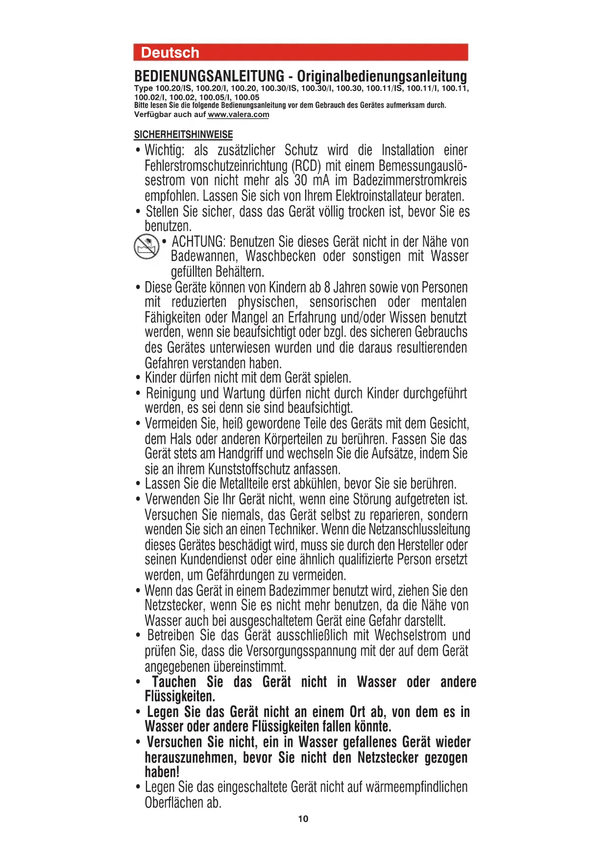 Stellen. Sollten Sie die Garantie in Anspruch nehmen müssen, dann senden Sie bitte das defekte Gerät gut verpackt an eine unserer autorisierten Service-Stellen. Vergessen Sie nicht, unbedingt die Garantiekarte und/oder den Kaufbeleg beizufügen, da ohne diese keine Garantieleistung erfolgen kann. VALERA ist eine eingetragene Schutzmarke der Ligo Electric S.A. - Schweiz Das Symbol auf dem Produkt oder seiner Verpackung weist darauf hin, dass dieses Produkt nicht als normaler Haushaltsabfall zu behandeln ist, sondern an einem Sammelpunkt für das Recycling von elektrischen und elektronischen Geräten abgegeben werden muss. Durch Ihren Beitrag zum korrekten Entsorgen dieses Produktes schützen Sie die Umwelt und die Gesundheit Ihrer Mitmenschen. Umwelt und Gesundheit werden durch falsches Entsorgen gefährdet. Weitere Informationen über das Recycling dieses Produkts erhalten Sie von Ihrem Rathaus, Ihrer Müllabfuhr oder dem Geschäft, in dem Sie das Produkt gekauft haben. 00060714 int_mar2017:Layout 1 07/03/2017 9.20 Pagina 1213 Français INSTRUCTIONS POUR L’UTILISATION - Instructions originales Type 100.20/IS, 100.20/I, 100.20, 100.30/IS, 100.30/I, 100.30, 100.11/IS, 100.11/I, 100.11, 100.02/I, 100.02, 100.05/I, 100.05 Lire attentivement les instructions suivantes avant d'utiliser le lisseur. Disponible aussi sur www.valera.com