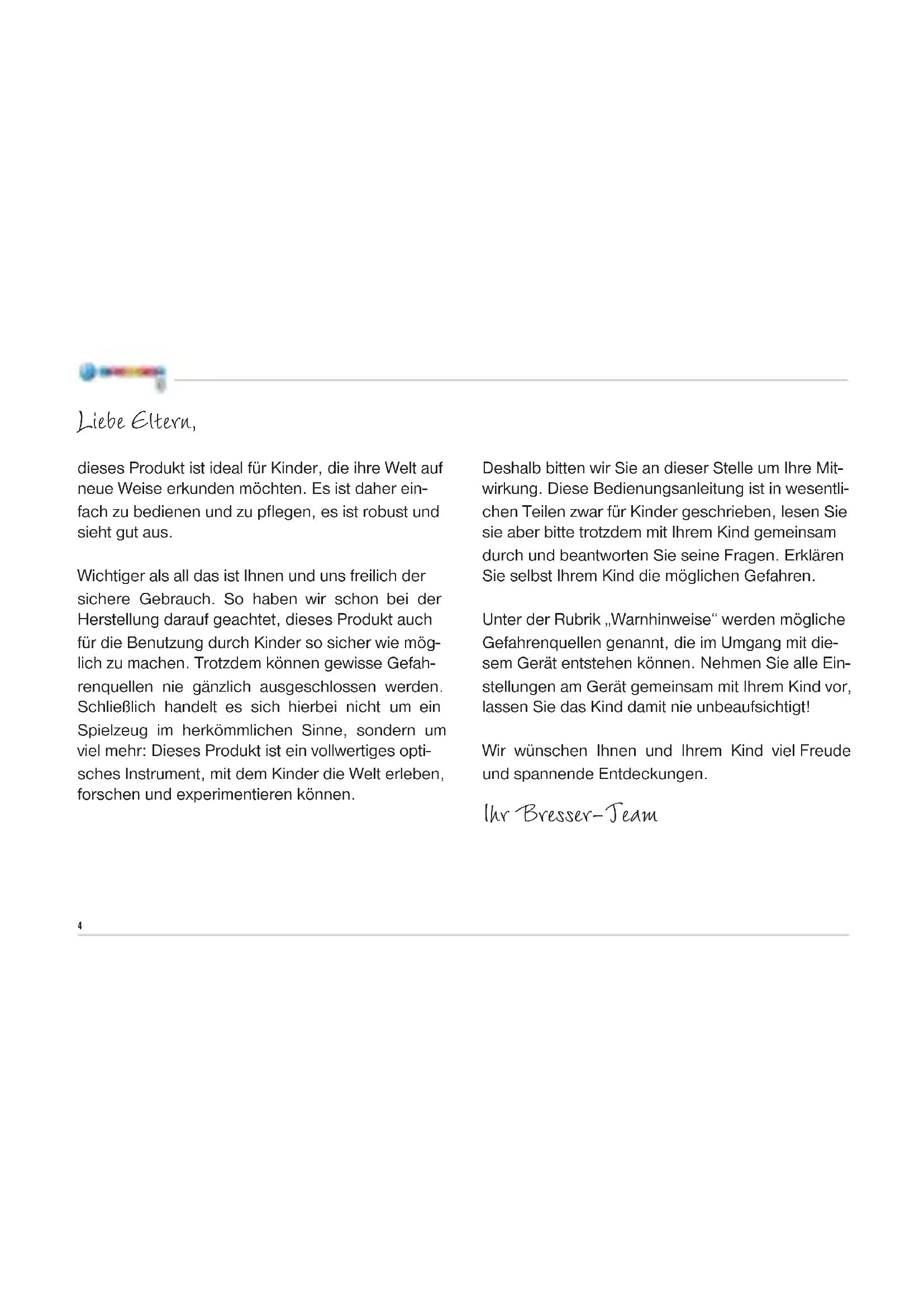 1&4 Liebe Eltern, dieses Produkt ist ideal für Kinder, die ihre Welt auf neue Weise erkunden möchten. Es ist daher ein- fach zu bedienen und zu pegen, es ist robust und sieht gut aus. Wichtiger als all das ist Ihnen und uns freilich der sichere Gebrauch. So haben wir schon bei der Herstellung darauf geachtet, dieses Produkt auch für die Benutzung durch Kinder so sicher wie mög- lich zu machen. Trotzdem können gewisse Gefah- renquellen nie gänzlich ausgeschlossen werden. Schließlich handelt es sich hierbei nicht um ein Spielzeug im herkömmlichen Sinne, sondern um viel mehr: Dieses Produkt ist ein vollwertiges opti- sches Instrument, mit dem Kinder die Welt erleben, forschen und experimentieren können. Deshalb bitten wir Sie an dieser Stelle um Ihre Mit- wirkung. Diese Bedienungsanleitung ist in wesentli- chen Teilen zwar für Kinder geschrieben, lesen Sie sie aber bitte trotzdem mit Ihrem Kind gemeinsam durch und beantworten Sie seine Fragen. Erklären Sie selbst Ihrem Kind die möglichen Gefahren. Unter der Rubrik „Warnhinweise“ werden mögliche Gefahrenquellen genannt, die im Umgang mit die- sem Gerät entstehen können. Nehmen Sie alle Ein- stellungen am Gerät gemeinsam mit Ihrem Kind vor, lassen Sie das Kind damit nie unbeaufsichtigt! Wir wünschen Ihnen und Ihrem Kind viel Freude und spannende Entdeckungen. Ihr Bresser-Team5