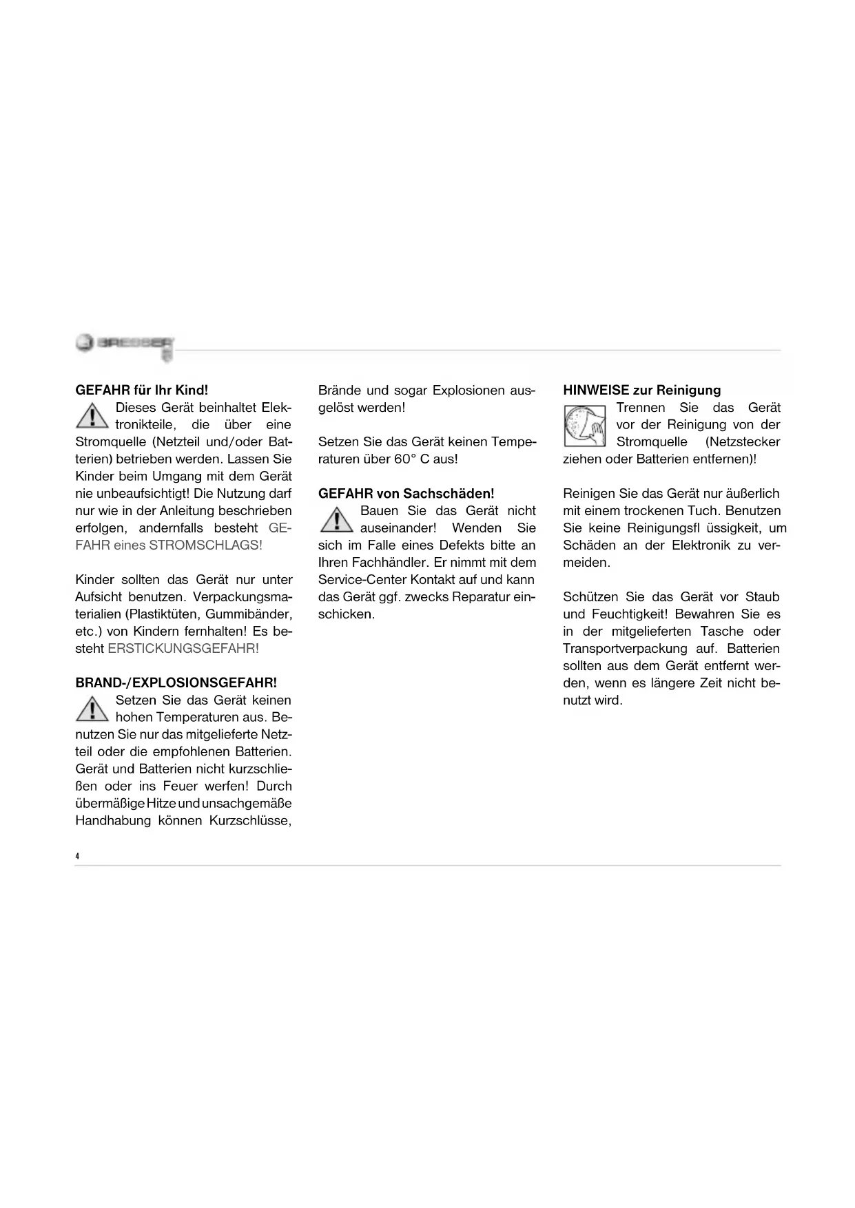 1%4 GEFAHR für Ihr Kind! Dieses Gerät beinhaltet Elek- tronikteile, die über eine Stromquelle (Netzteil und/oder Bat- terien) betrieben werden. Lassen Sie Kinder beim Umgang mit dem Gerät nie unbeaufsichtigt! Die Nutzung darf nur wie in der Anleitung beschrieben erfolgen, andernfalls besteht GE- FAHR eines STROMSCHLAGS! Kinder sollten das Gerät nur unter Aufsicht benutzen. Verpackungsma- terialien (Plastiktüten, Gummibänder, etc.) von Kindern fernhalten! Es be- steht ERSTICKUNGSGEFAHR! BRAND-/EXPLOSIONSGEFAHR! Setzen Sie das Gerät keinen hohen Temperaturen aus. Be- nutzen Sie nur das mitgelieferte Netz- teil oder die empfohlenen Batterien. Gerät und Batterien nicht kurzschlie- ßen oder ins Feuer werfen! Durch übermäßige Hitze und unsachgemäße Handhabung können Kurzschlüsse, Brände und sogar Explosionen aus- gelöst werden! Setzen Sie das Gerät keinen Tempe- raturen über 60° C aus! GEFAHR von Sachschäden! Bauen Sie das Gerät nicht auseinander! Wenden Sie sich im Falle eines Defekts bitte an Ihren Fachhändler. Er nimmt mit dem Service-Center Kontakt auf und kann das Gerät ggf. zwecks Reparatur ein- schicken. HINWEISE zur Reinigung Trennen Sie das Gerät vor der Reinigung von der Stromquelle (Netzstecker ziehen oder Batterien entfernen)! Reinigen Sie das Gerät nur äußerlich mit einem trockenen Tuch. Benutzen Sie keine Reinigungsfl üssigkeit, um Schäden an der Elektronik zu ver- meiden. Schützen Sie das Gerät vor Staub und Feuchtigkeit! Bewahren Sie es in der mitgelieferten Tasche oder Transportverpackung auf. Batterien sollten aus dem Gerät entfernt wer- den, wenn es längere Zeit nicht be- nutzt wird.5 ENTSORGUNG Entsorgen Sie die Verpa- ckungsmaterialien sortenrein. Informationen zur ordnungsgemäßen Entsorgung erhalten Sie beim kom- munalen Entsorgungsdienstleister oder Umweltamt. Werfen Sie Elektrogeräte nicht in den Hausmüll! Gemäß der Europäischen Richtlinie 2002/96/EG über Elekt- ro- und Elektronik-Altgeräte und de- ren Umsetzung in nationales Recht müssen verbrauchte Elektrogeräte getrennt gesammelt und einer um- weltgerechten Wiederverwertung zugeführt werden. Entladene Altbatterien und Akkus müssen vom Verbraucher in Batte- riesammelgefäßen entsorgt werden. Informationen zur Entsorgung alter Geräte oder Batterien, die nach dem