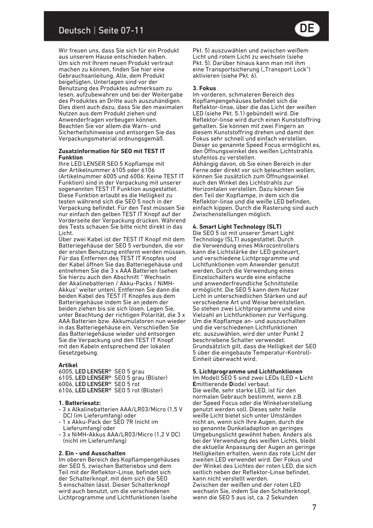 Deutsch | Seite 07-11 Wir freuen uns, dass Sie sich für ein Produkt aus unserem Hause entschieden haben. Um sich mit Ihrem neuen Produkt vertraut machen zu können, finden Sie hier eine Gebrauchsanleitung. Alle, dem Produkt beigefügten, Unterlagen sind vor der Benutzung des Produktes aufmerksam zu lesen, aufzubewahren und bei der Weitergabe des Produktes an Dritte auch auszuhändigen. Dies dient auch dazu, dass Sie den maximalen Nutzen aus dem Produkt ziehen und Anwenderfragen vorbeugen können. Beachten Sie vor allem die Warn- und Sicherheitshinweise und entsorgen Sie das Verpackungsmaterial ordnungsgemäß. Zusatzinformation für SEO mit TEST IT Funktion Ihre LED LENSER SEO 5 Kopflampe mit der Artikelnummer 6105 oder 6106 (Artikelnummer 6005 und 6006: Keine TEST IT Funktion) sind in der Verpackung mit unserer sogenannten TEST IT Funktion ausgestattet. Diese Funktion erlaubt es die Helligkeit zu testen während sich die SEO 5 noch in der Verpackung befindet. Für den Test müssen Sie nur einfach den gelben TEST IT Knopf auf der Vorderseite der Verpackung drücken. Während des Tests schauen Sie bitte nicht direkt in das Licht. Über zwei Kabel ist der TEST IT Knopf mit dem Batteriegehäuse der SEO 5 verbunden, die vor der ersten Benutzung entfernt werden müssen. Für das Entfernen des TEST IT Knopfes und der Kabel öffnen Sie das Batteriegehäuse und entnehmen Sie die 3 x AAA Batterien (sehen Sie hierzu auch den Abschnitt “ Wechseln der Akalinebatterien / Akku-Packs / NiMH- Akkus“ weiter unten). Entfernen Sie dann die beiden Kabel des TEST IT Knopfes aus dem Batteriegehäuse indem Sie an jedem der beiden ziehen bis sie sich lösen. Legen Sie, unter Beachtung der richtigen Polarität, die 3 x AAA Batterien bzw. Akkumulatoren nun wieder in das Batteriegehäuse ein. Verschließen Sie das Batteriegehäuse wieder und entsorgen Sie die Verpackung und den TEST IT Knopf mit den Kabeln entsprechend der lokalen Gesetzgebung. Artikel 6005, LED LENSER® SEO 5 grau 6105, LED LENSER® SEO 5 grau (Blister) 6006, LED LENSER® SEO 5 rot 6106, LED LENSER® SEO 5 rot (Blister)