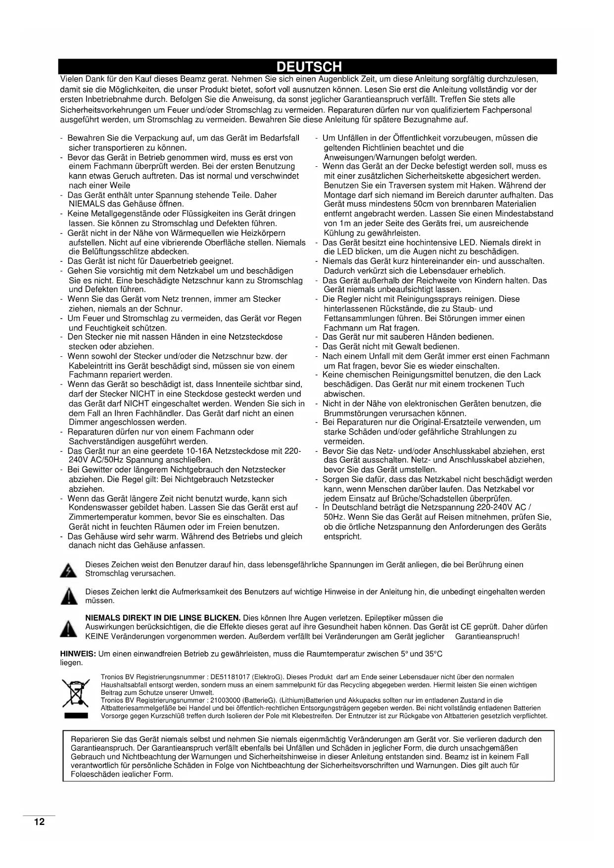 ONDERHOUD Het reinigen van inwendige en uitwendige optische lenzen en / of spiegels moet regelmatig worden uitgevoerd om de lichtopbrengst te optimaliseren. Reinigingsfrequentie is afhankelijk van de omgeving waarin het armatuur wordt gebruikt: een klamme, rokerige of bijzonder vuile omgeving kan een grotere opeenhoping van vuil veroorzaken op de optische uitrusting. Zorg er voor dat gedurende het onderhoud zich geen individuen bevinden onder het apparaat. Schakel het apparaat uit, trek de stekker uit het stopcontact en wacht tot het apparaat is afgekoeld. Behuizing, bevestiging en installaties (plafond, truss, ophanging) moeten van deugdelijke aard zijn. Het netsnoer mag niet beschadigd zijn en moet direct vervangen worden, ook bij kleine defecten. Om het apparaat te beschermen tegen oververhitting dienen ventilatoren en ventilatie openingen iedere maand gereinigd te worden. De lens en spiegels dienen periodiek gereinigd te worden. Deze periode is afhankelijk van de aanwezige viezigheid. Alleen reinigen met een droge doek, gebruik geen reinigingsmiddelen. Modificaties door de fabrikant worden zonder u op de hoogte te brengen doorgevoerd. LET OP: Wij adviseren u het reinigen en servicen van het apparaat uit te laten voeren door een vakbekwaam persoon.12 DEUTSCH Vielen Dank für den Kauf dieses Beamz gerat. Nehmen Sie sich einen Augenblick Zeit, um diese Anleitung sorgfältig durchzulesen, damit sie die Möglichkeiten, die unser Produkt bietet, sofort voll ausnutzen können. Lesen Sie erst die Anleitung vollständig vor der ersten Inbetriebnahme durch. Befolgen Sie die Anweisung, da sonst jeglicher Garantieanspruch verfällt. Treffen Sie stets alle Sicherheitsvorkehrungen um Feuer und/oder Stromschlag zu vermeiden. Reparaturen dürfen nur von qualifiziertem Fachpersonal ausgeführt werden, um Stromschlag zu vermeiden. Bewahren Sie diese Anleitung für spätere Bezugnahme auf. - Bewahren Sie die Verpackung auf, um das Gerät im Bedarfsfall sicher transportieren zu können. - Bevor das Gerät in Betrieb genommen wird, muss es erst von einem Fachmann überprüft werden. Bei der ersten Benutzung kann etwas Geruch auftreten. Das ist normal und verschwindet nach einer Weile - Das Gerät enthält unter Spannung stehende Teile. Daher NIEMALS das Gehäuse öffnen. - Keine Metallgegenstände oder Flüssigkeiten ins Gerät dringen lassen. Sie können zu Stromschlag und Defekten führen. - Gerät nicht in der Nähe von Wärmequellen wie Heizkörpern aufstellen. Nicht auf eine vibrierende Oberfläche stellen. Niemals die Belüftungsschlitze abdecken. - Das Gerät ist nicht für Dauerbetrieb geeignet. - Gehen Sie vorsichtig mit dem Netzkabel um und beschädigen Sie es nicht. Eine beschädigte Netzschnur kann zu Stromschlag und Defekten führen. - Wenn Sie das Gerät vom Netz trennen, immer am Stecker ziehen, niemals an der Schnur. - Um Feuer und Stromschlag zu vermeiden, das Gerät vor Regen und Feuchtigkeit schützen. - Den Stecker nie mit nassen Händen in eine Netzsteckdose stecken oder abziehen. - Wenn sowohl der Stecker und/oder die Netzschnur bzw. der Kabeleintritt ins Gerät beschädigt sind, müssen sie von einem Fachmann repariert werden. - Wenn das Gerät so beschädigt ist, dass Innenteile sichtbar sind, darf der Stecker NICHT in eine Steckdose gesteckt werden und das Gerät darf NICHT eingeschaltet werden. Wenden Sie sich in dem Fall an Ihren Fachhändler. Das Gerät darf nicht an einen Dimmer angeschlossen werden. - Reparaturen dürfen nur von einem Fachmann oder Sachverständigen ausgeführt werden. - Das Gerät nur an eine geerdete 10-16A Netzsteckdose mit 220- 240V AC/50Hz Spannung anschließen. - Bei Gewitter oder längerem Nichtgebrauch den Netzstecker abziehen. Die Regel gilt: Bei Nichtgebrauch Netzstecker abziehen. - Wenn das Gerät längere Zeit nicht benutzt wurde, kann sich Kondenswasser gebildet haben. Lassen Sie das Gerät erst auf Zimmertemperatur kommen, bevor Sie es einschalten. Das Gerät nicht in feuchten Räumen oder im Freien benutzen. - Das Gehäuse wird sehr warm. Während des Betriebs und gleich danach nicht das Gehäuse anfassen. - Um Unfällen in der Öffentlichkeit vorzubeugen, müssen die geltenden Richtlinien beachtet und die Anweisungen/Warnungen befolgt werden. - Wenn das Gerät an der Decke befestigt werden soll, muss es mit einer zusätzlichen Sicherheitskette abgesichert werden. Benutzen Sie ein Traversen system mit Haken. Während der Montage darf sich niemand im Bereich darunter aufhalten. Das Gerät muss mindestens 50cm von brennbaren Materialien entfernt angebracht werden. Lassen Sie einen Mindestabstand von 1m an jeder Seite des Geräts frei, um ausreichende Kühlung zu gewährleisten. - Das Gerät besitzt eine hochintensive LED. Niemals direkt in die LED blicken, um die Augen nicht zu beschädigen. - Niemals das Gerät kurz hintereinander ein- und ausschalten. Dadurch verkürzt sich die Lebensdauer erheblich. - Das Gerät außerhalb der Reichweite von Kindern halten. Das Gerät niemals unbeaufsichtigt lassen. - Die Regler nicht mit Reinigungssprays reinigen. Diese hinterlassenen Rückstände, die zu Staub- und Fettansammlungen führen. Bei Störungen immer einen Fachmann um Rat fragen. - Das Gerät nur mit sauberen Händen bedienen. - Das Gerät nicht mit Gewalt bedienen. - Nach einem Unfall mit dem Gerät immer erst einen Fachmann um Rat fragen, bevor Sie es wieder einschalten. - Keine chemischen Reinigungsmittel benutzen, die den Lack beschädigen. Das Gerät nur mit einem trockenen Tuch abwischen. - Nicht in der Nähe von elektronischen Geräten benutzen, die Brummstörungen verursachen können. - Bei Reparaturen nur die Original-Ersatzteile verwenden, um starke Schäden und/oder gefährliche Strahlungen zu vermeiden. - Bevor Sie das Netz- und/oder Anschlusskabel abziehen, erst das Gerät ausschalten. Netz- und Anschlusskabel abziehen, bevor Sie das Gerät umstellen. - Sorgen Sie dafür, dass das Netzkabel nicht beschädigt werden kann, wenn Mensche