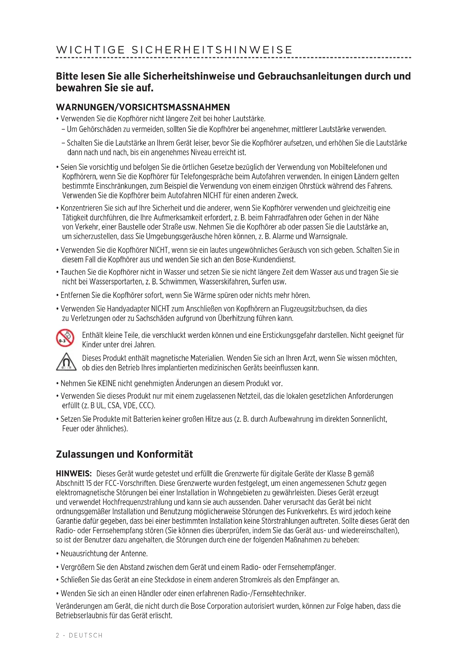 Dieses Gerät erfüllt die Bestimmungen in Teil 15 der FCC-Vorschriften und die lizenzfreien Standards von Industry Canada. Der Betrieb unterliegt den beiden folgenden Bedingungen: (1) dieses Gerät darf keine Störungen verursachen und (2)dieses Gerät muss jegliche Störungen dulden, einschließlich Störungen, die zu einem unerwünschten Betrieb führen. Dieses Gerät erfüllt die Strahlungsexpositionsgrenzwerte der FCC und von Industry Canada für die allgemeine Bevölkerung. Es darf nicht zusammen mit anderen Antennen oder Sendern aufgestellt oder betrieben werden. Erfüllt die IMDA-Anforderungen. CAN ICES-3 (B) /NMB-3 (B) Verwaltungsverordnung für energiearme Funkfrequenzgeräte Artikel XII Laut der „Verwaltungsverordnung für energiearme Funkfrequenzgeräte“ darf kein Unternehmen oder Benutzer ohne Erlaubnis durch die NCC Folgendes nicht: die Frequenz ändern, die Übertragungsleistung verbessern oder die ursprünglichen Eigenschaften sowie die Leistung für ein zugelassenes energiearmes Funkfrequenzgerät ändern. Artikel XIV Energiearme Funkfrequenzgeräte dürfen die Flugsicherheit nicht beeinträchtigen oder gesetzlich zulässige Kommunikation stören. Andernfalls muss der Benutzer den Betrieb sofort einstellen, bis keine Störung mehr auftritt. Besagte gesetzlich zulässige Kommunikation bedeutet Funkkommunikation, die in Übereinstimmung mit dem Telekommunikationsgesetz erfolgt. Energiearme Funkfrequenzgeräte müssen für Störung durch gesetzlich zulässige Kommunikation oder Geräte mit ISM-Funkwellenstrahlung empfänglich sein. Die Bose Corporation erklärt hiermit, dass dieses Produkt die wesentlichen Anforderungen und andere relevante Bestimmungen der Richtlinie 2014/53/EU und weitere geltende EU-Richtlinien erfüllt. Dievollständige Konformitätserklärung ist einsehbar unter www.Bose.com/compliance Für Europa: Frequenzband des Betriebs 2.400 bis 2483,5 MHz. Bluetooth®: Maximale Sendeleistung weniger als 20 dBm EIRP. Bluetooth Low Energy: Maximale spektrale Leistungsdichte weniger als 10 dBm/EIRP. Dieses Symbol bedeutet, dass das Produkt nicht mit dem Hausmüll entsorgt werden darf, sondern bei einer geeigneten Sammelstelle für das Recycling abgegeben werden muss. Die ordnungsgemäße Entsorgung und das Recycling tragen dazu bei, die natürlichen Ressourcen, die Gesundheit und die Umwelt zu schützen. Weitere Informationen zur Entsorgung und zum Recycling dieses Produkts erhalten Sie von Ihrer zuständigen Kommune, Ihrem Entsorgungsdienst oder dem Geschäft, in dem Sie dieses Produkt gekauft haben. Leere Batterien müssen getrennt entsorgt werden und gehören nicht in den Hausmüll. Nicht verbrennen. Das Herausnehmen des aufladbaren Lithium-Ionen-Akkus aus diesem Produkt sollte nur durch einen Fachmann erfolgen. Bitte wenden Sie sich für weitere Informationen an Ihren örtlichen Bose-Händler oder sehen Sie unter http://products.bose.com/static/compliance/index.html nach.4 - DEUTSCH