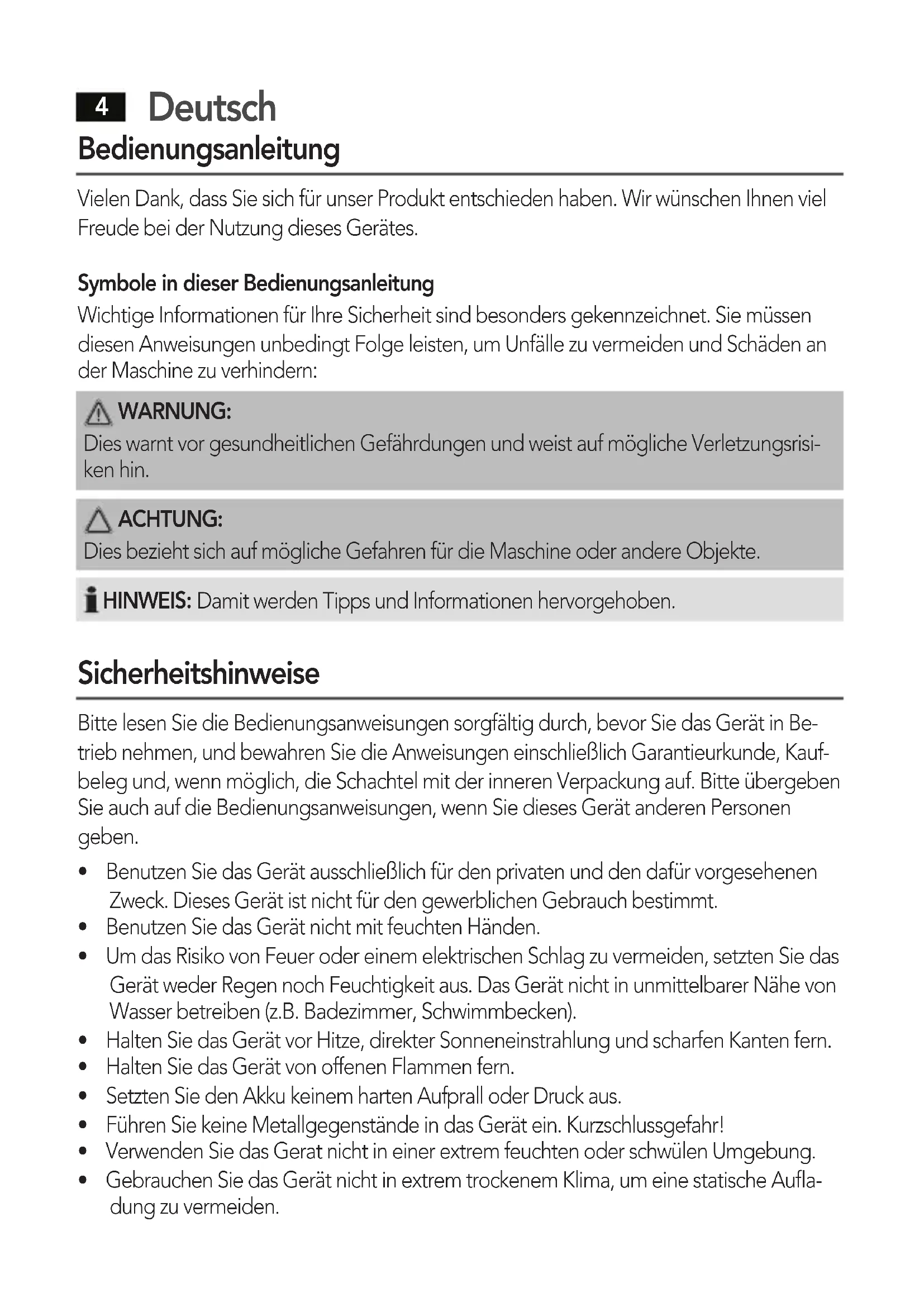 Bedienungsanleitung Vielen Dank, dass Sie sich für unser Produkt entschieden haben. Wir wünschen Ihnen viel Freude bei der Nutzung dieses Gerätes. Symbole in dieser Bedienungsanleitung Wichtige Informationen für Ihre Sicherheit sind besonders gekennzeichnet. Sie müssen diesen Anweisungen unbedingt Folge leisten, um Unfälle zu vermeiden und Schäden an der Maschine zu verhindern: WARNUNG: Dies warnt vor gesundheitlichen Gefährdungen und weist auf mögliche Verletzungsrisi- ken hin. ACHTUNG: Dies bezieht sich auf mögliche Gefahren für die Maschine oder andere Objekte. HINWEIS: Damit werden Tipps und Informationen hervorgehoben. Sicherheitshinweise Bitte lesen Sie die Bedienungsanweisungen sorgfältig durch, bevor Sie das Gerät in Be- trieb nehmen, und bewahren Sie die Anweisungen einschließlich Garantieurkunde, Kauf- beleg und, wenn möglich, die Schachtel mit der inneren Verpackung auf. Bitte übergeben Sie auch auf die Bedienungsanweisungen, wenn Sie dieses Gerät anderen Personen geben.