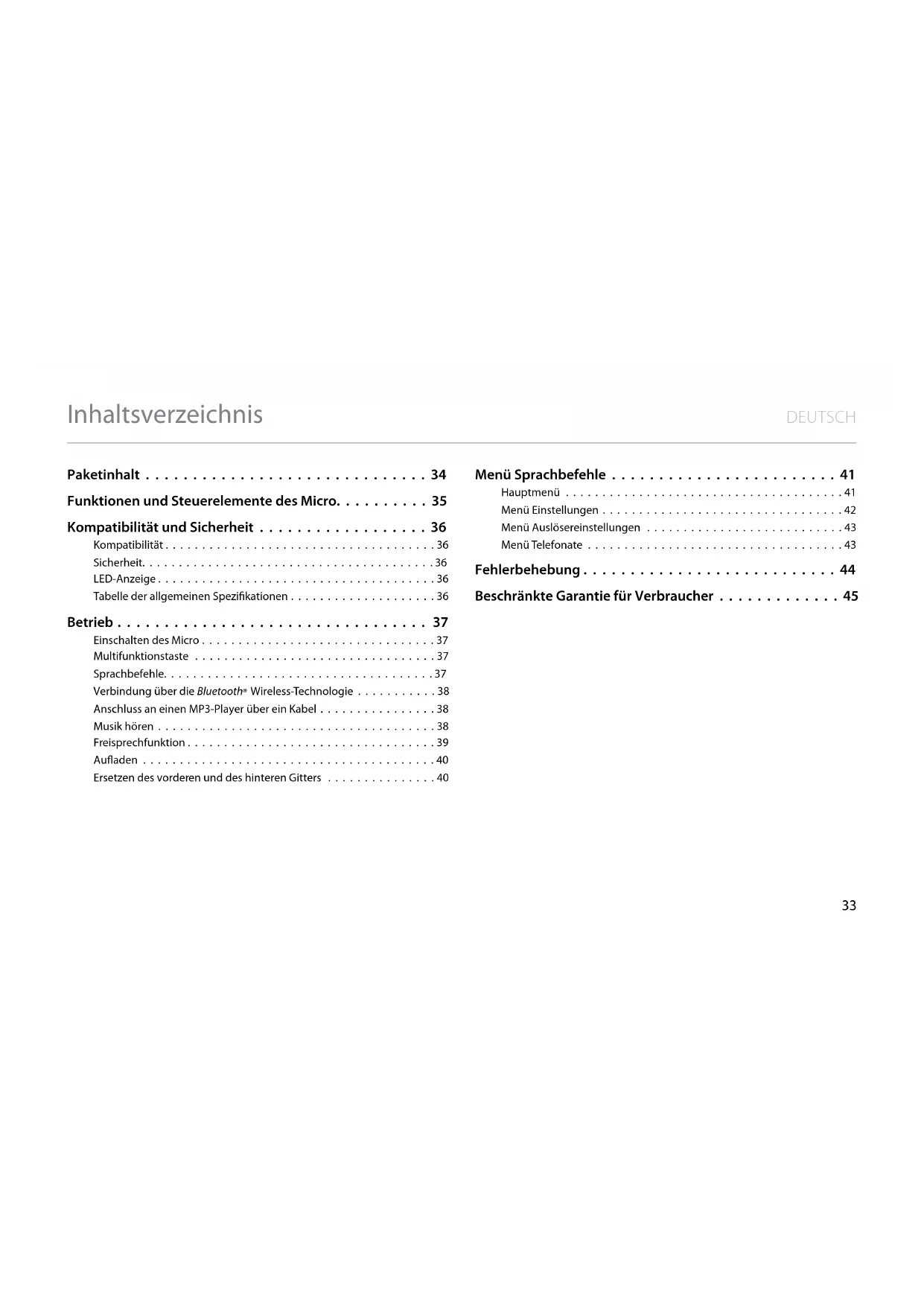 | Der MP3-Player ist über das 3,5 mm-Kabel angeschlossen, aber es wird keine Musik abgespielt | • Stellen Sie sichere, dass der Micro nicht mit einem Bluetooth -Gerät gekoppelt ist. Die Bluetooth -Verbindung hat Vorrang vor dem kabelgebundenen Gerät | |